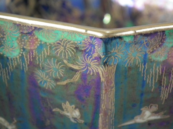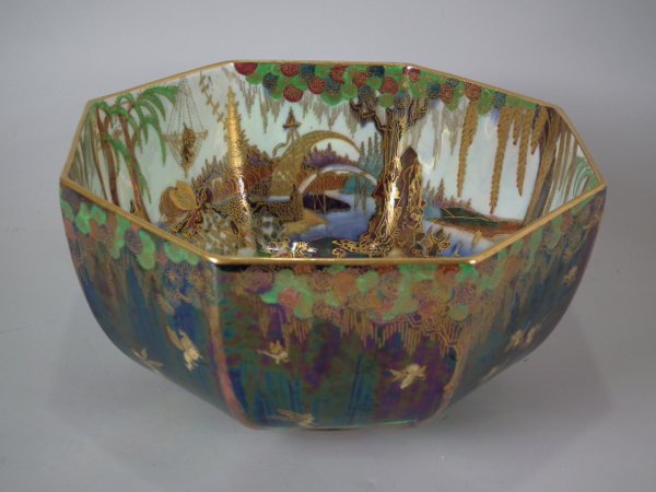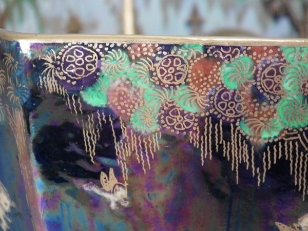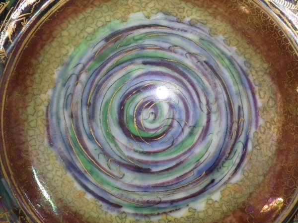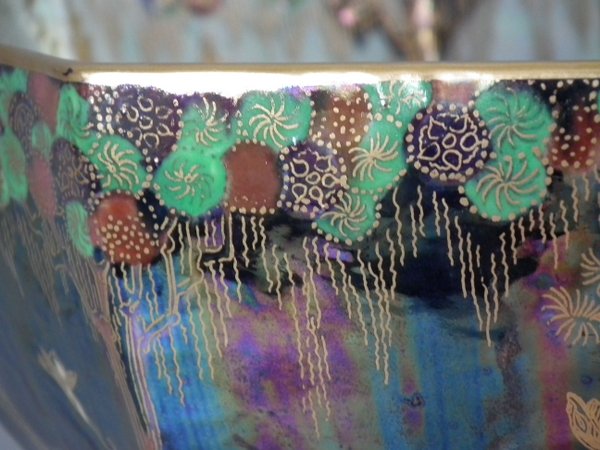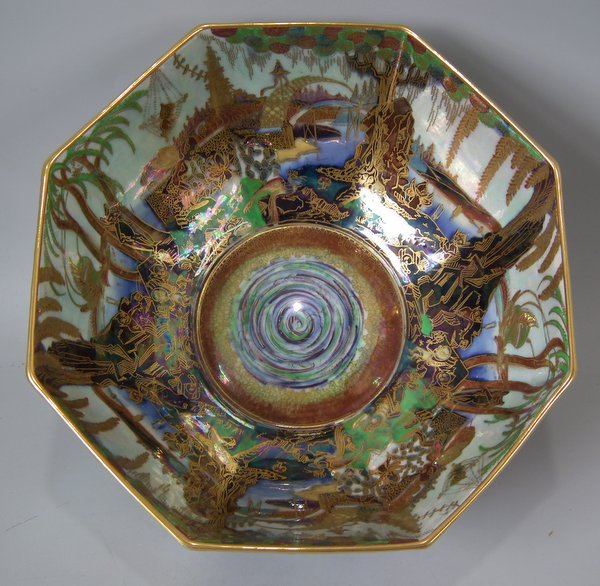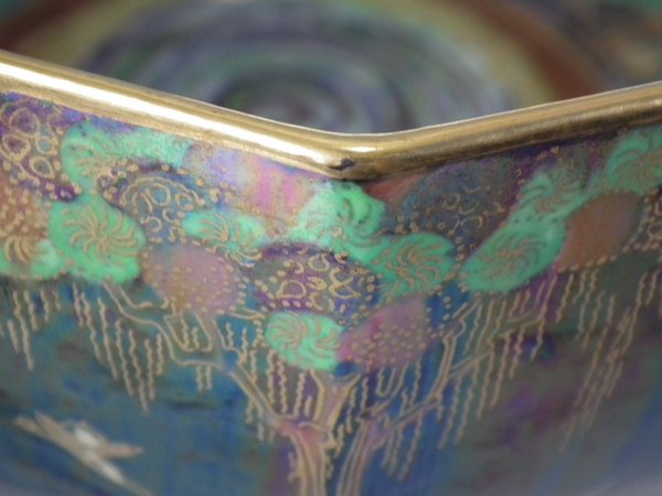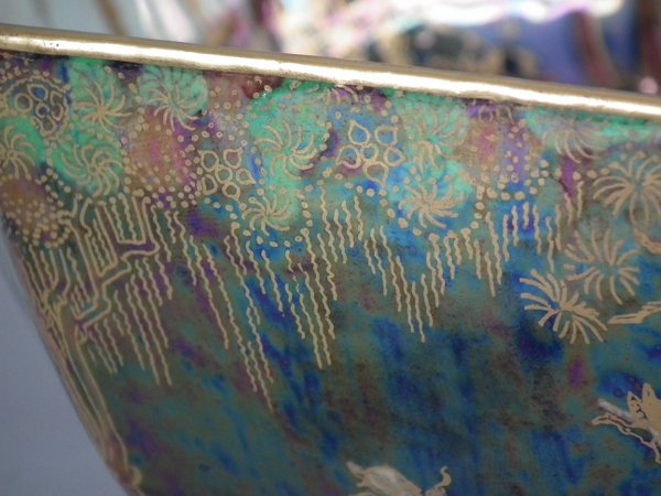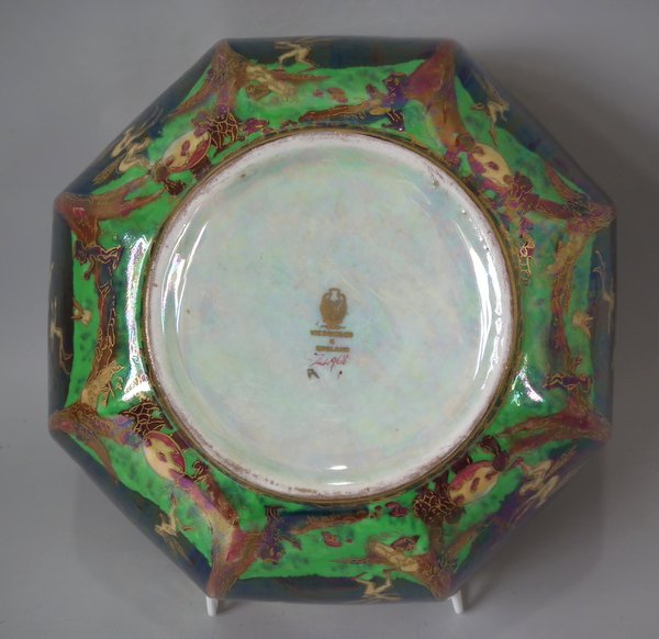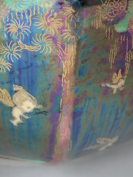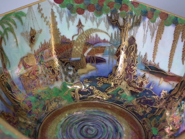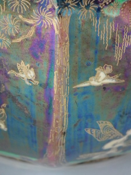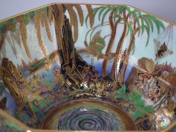 'Fairy in a cage' design, on a mother of pearl ground, to the interior.