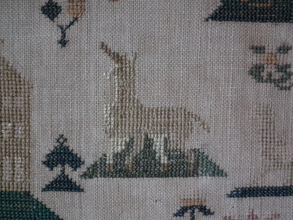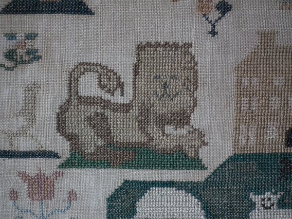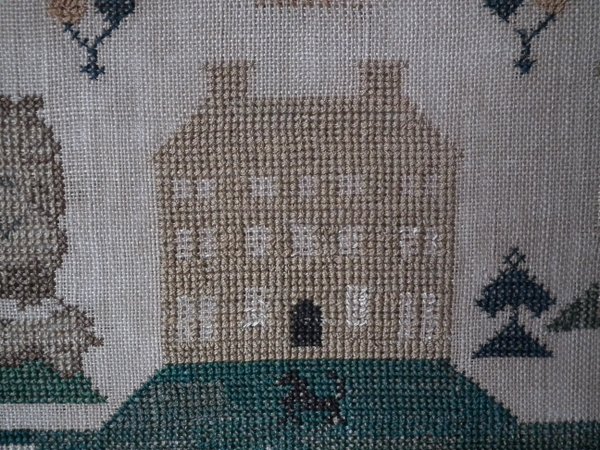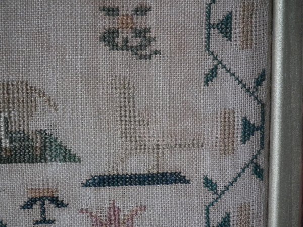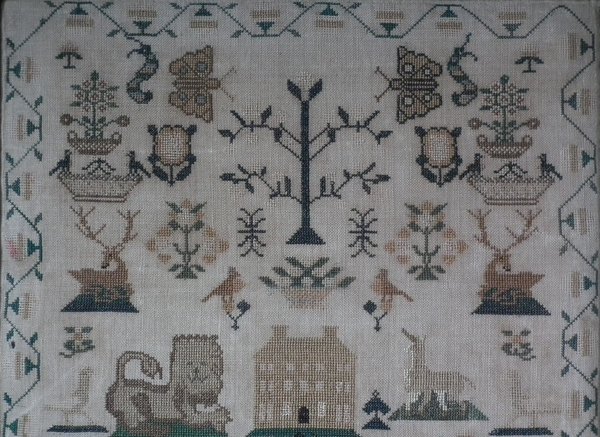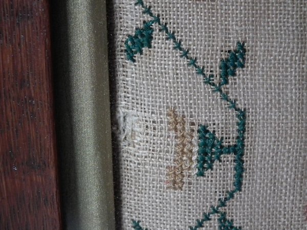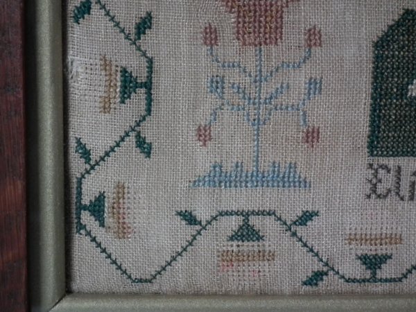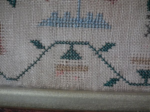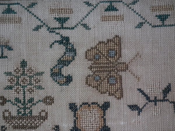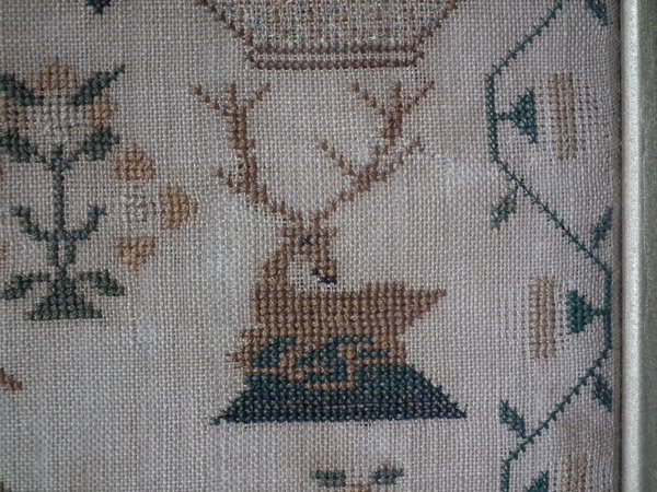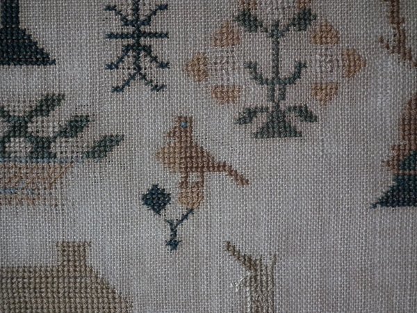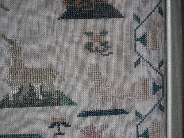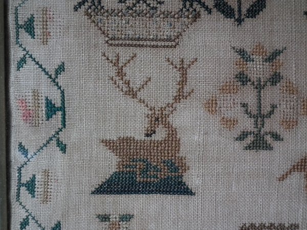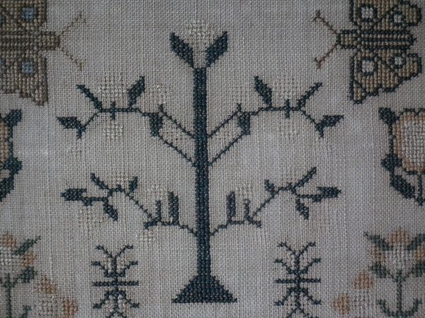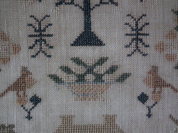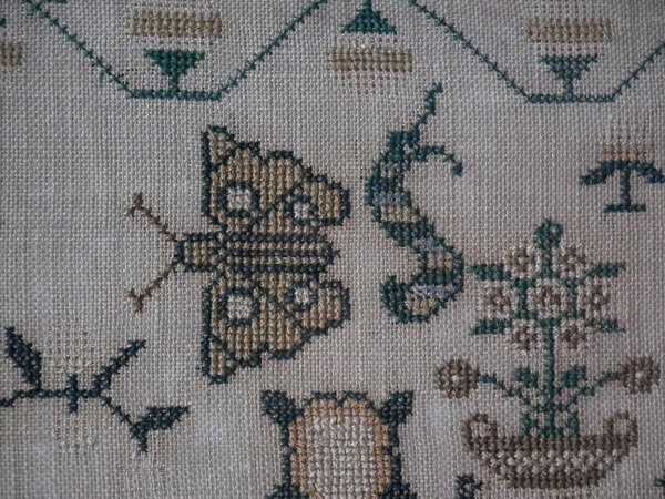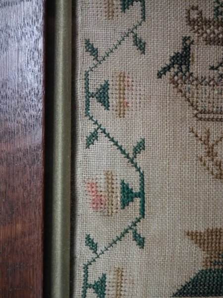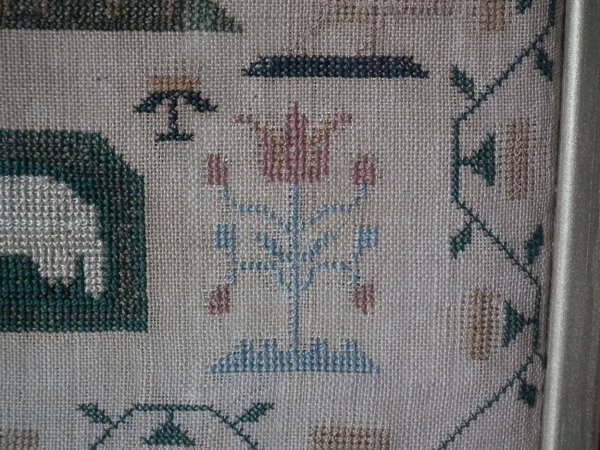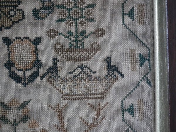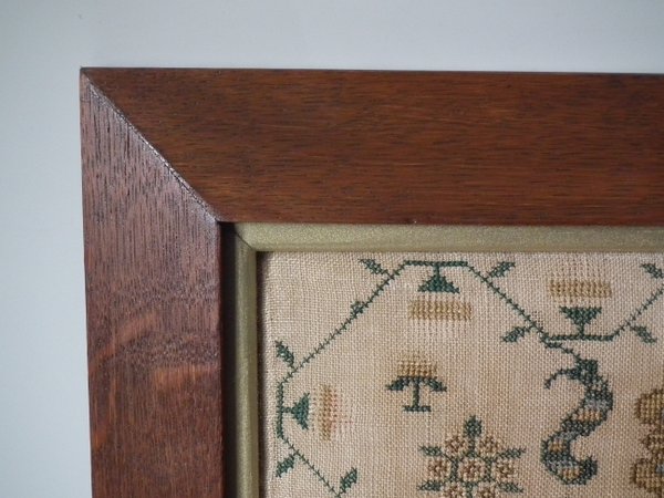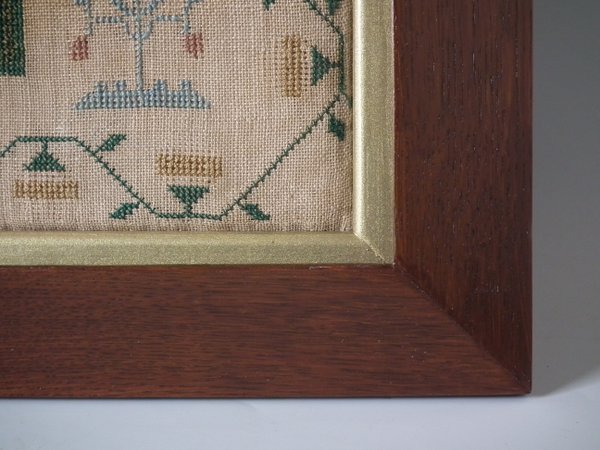 The sampler is worked in silk on canvas ground, in cross stitch throughout.