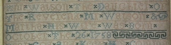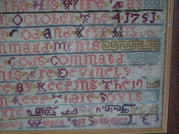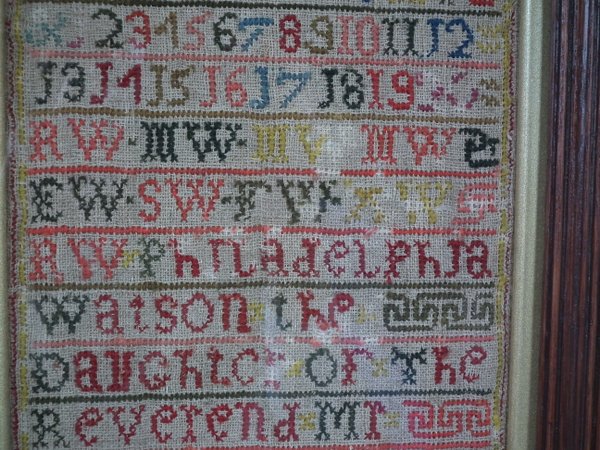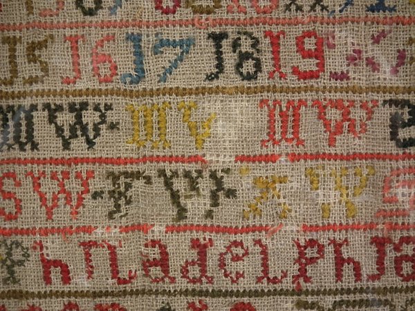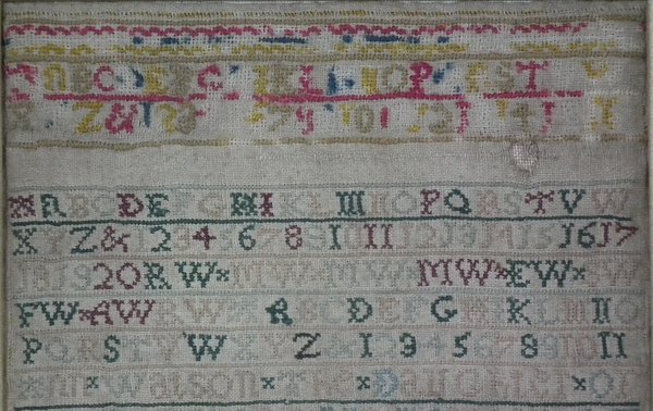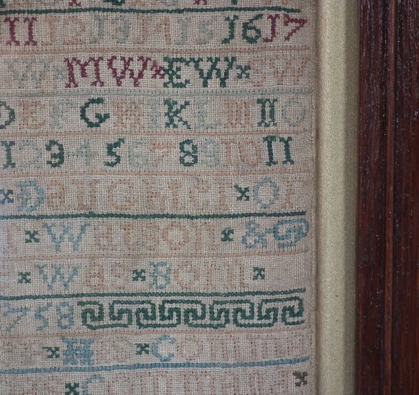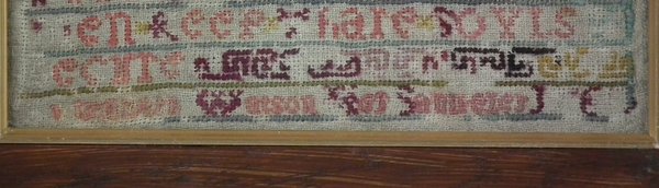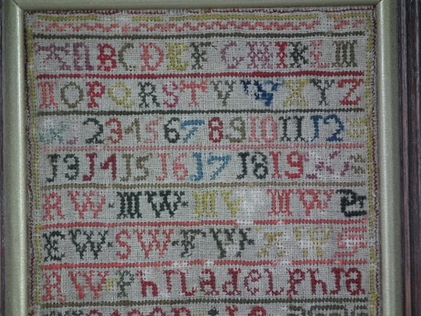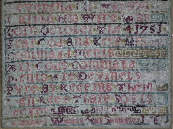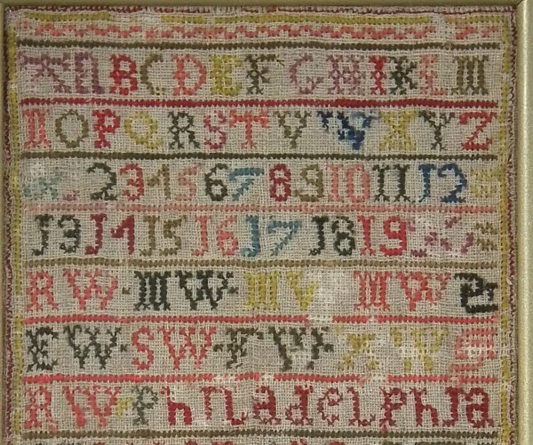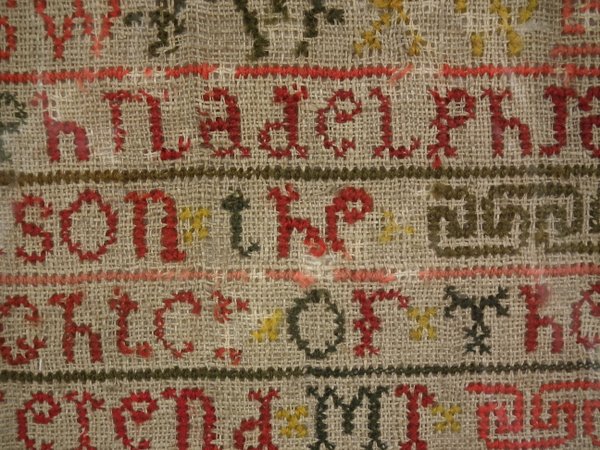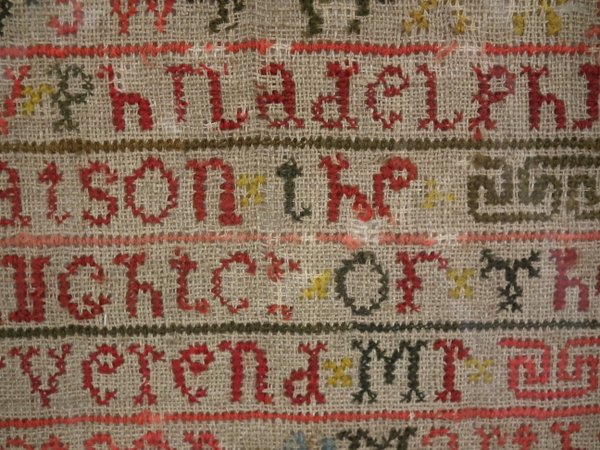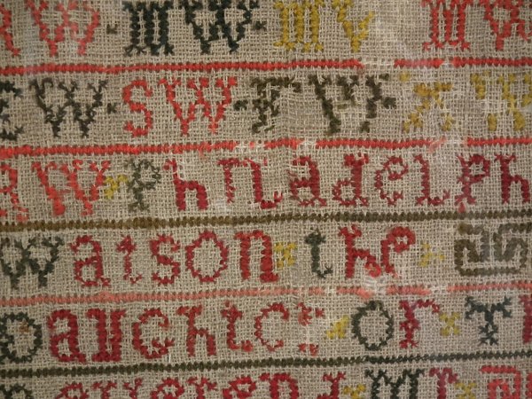 Philadelphia Watson sampler: The sampler is worked in wool on linen ground, in cross stitch throughout.