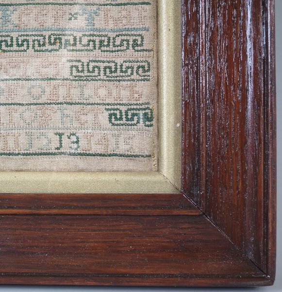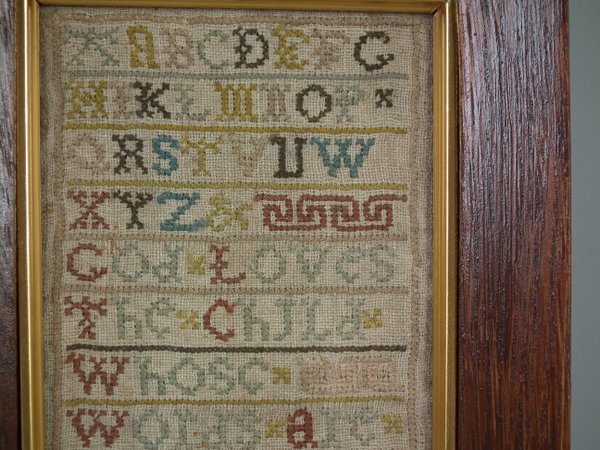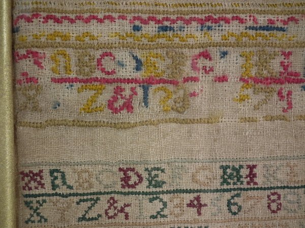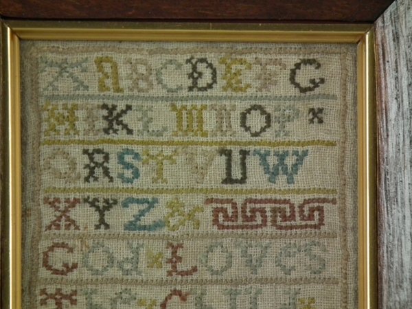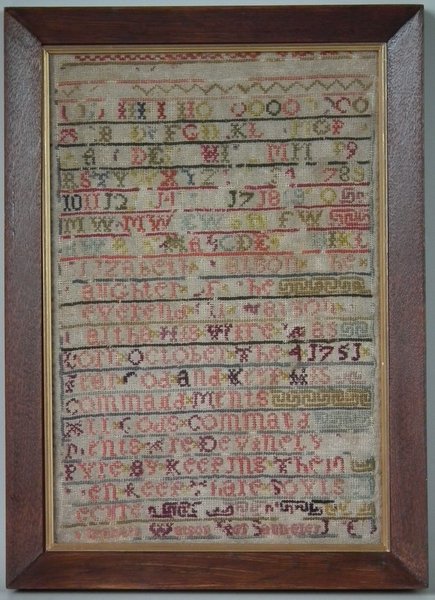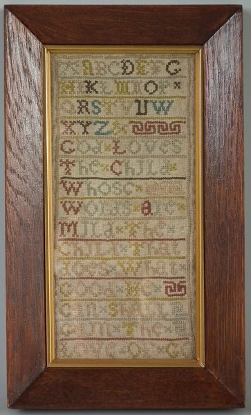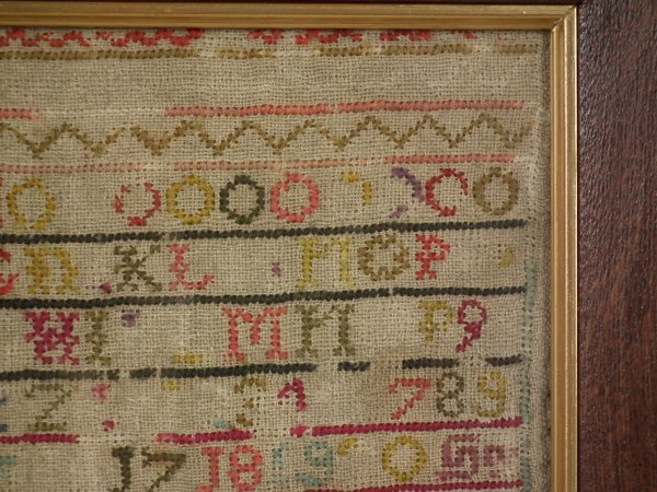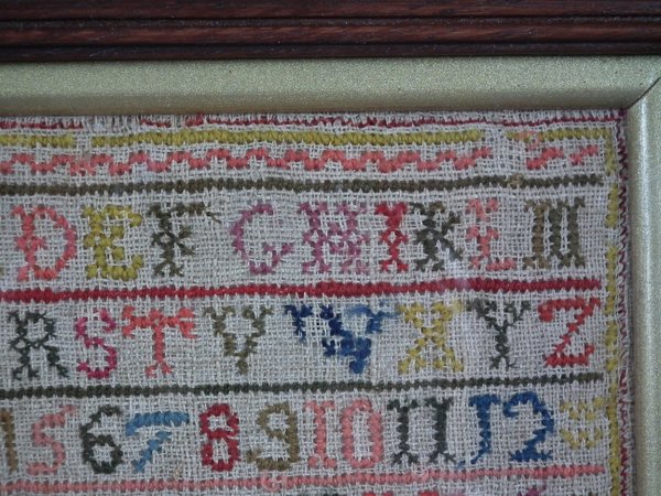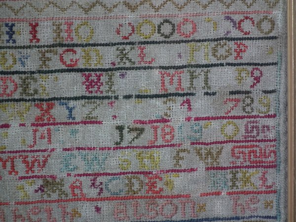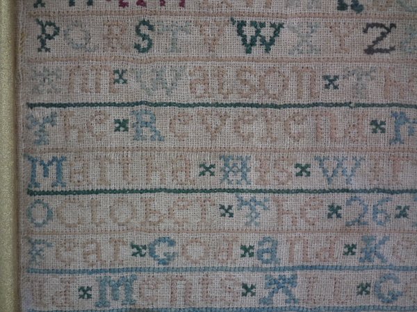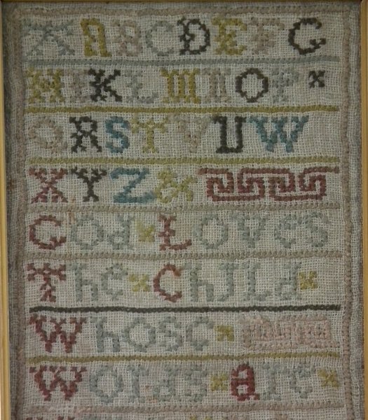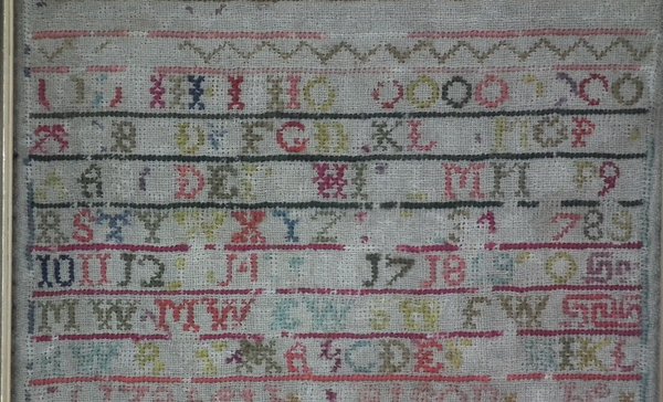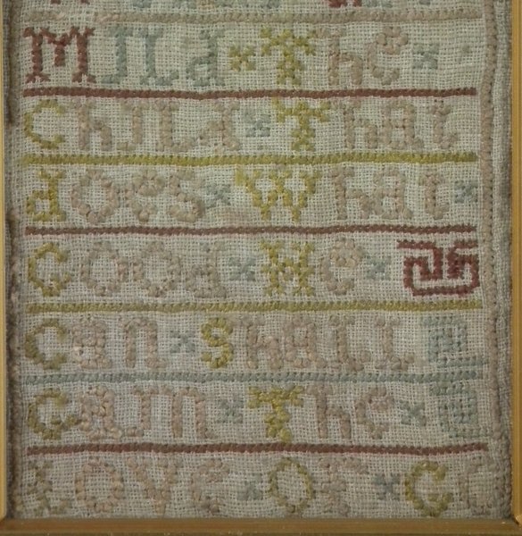 Philadelphia Watson sampler: The sampler is worked in wool on linen ground, in cross stitch throughout.