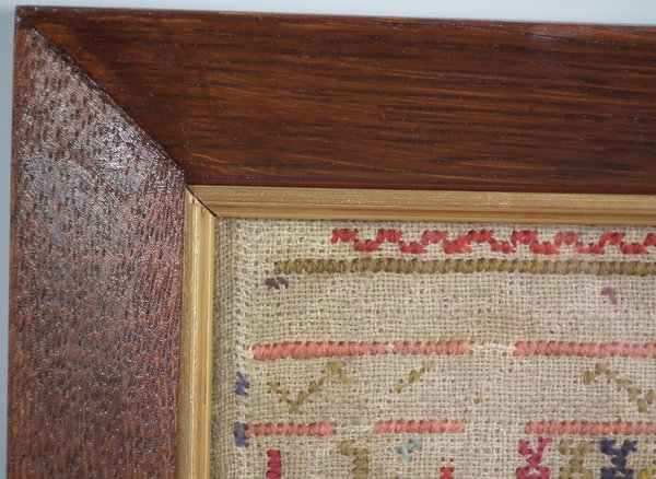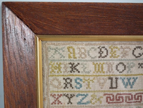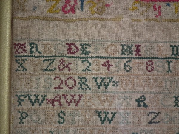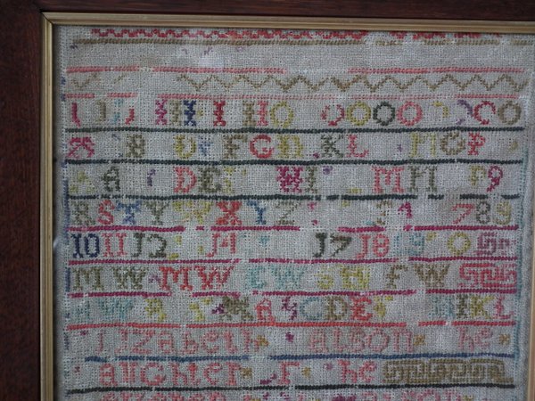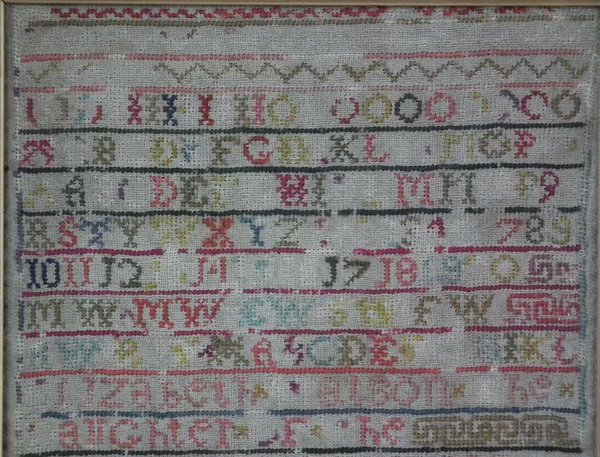 Elizabeth Watson sampler: The sampler is worked in wool on linen ground, in cross stitch throughout.