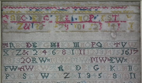 Unnamed Sampler. The sampler is worked in fine wool on linen ground, in cross stitch throughout.