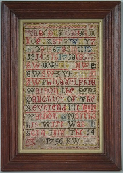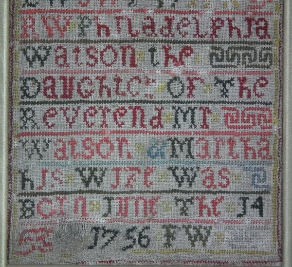Signed 'PhIladeLphIa Watson the DauGhter oF The Reverend Mr Watson & Martha hIs WIFe Was Born June The 14 1756'.