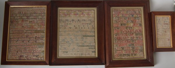George III, circa 1760s. 11ins by 7.5ins wide; 9.75ins by 7.5ins wide; 6.5ins by 3ins wide; 10.25ins by 6.25ins wide. Four Antique Samplers by the Watson sisters, circa 1760s. Framed in old wood frames with with glass (2 with gilt slip). Mounted on acid free card with chipboard backing. Colours red, yellow, dark brown, pink, purple, greens and blues.