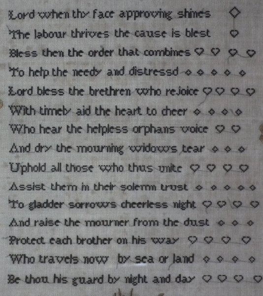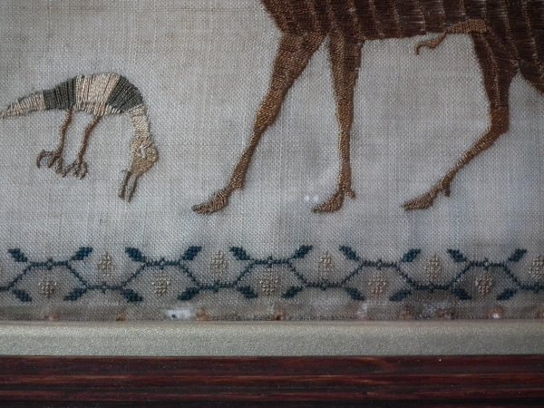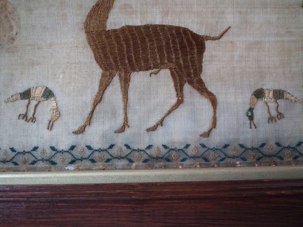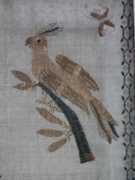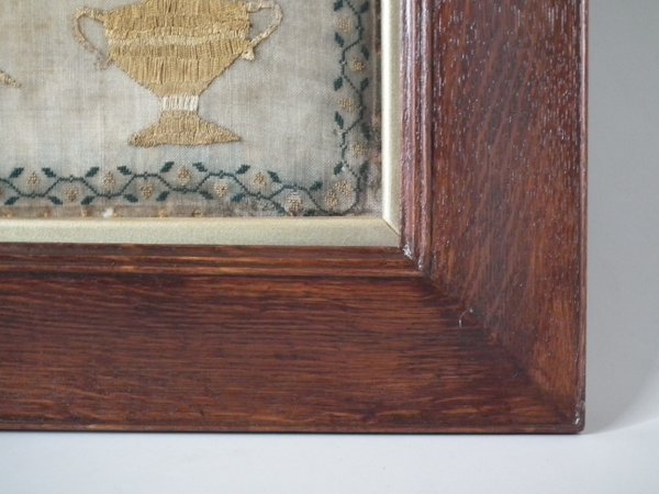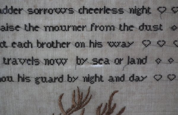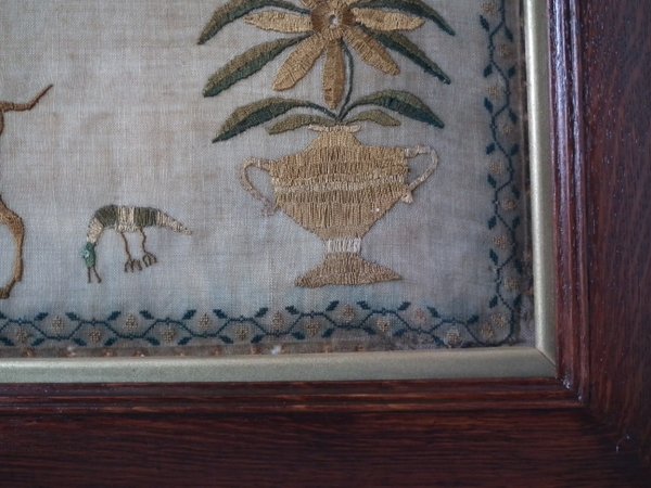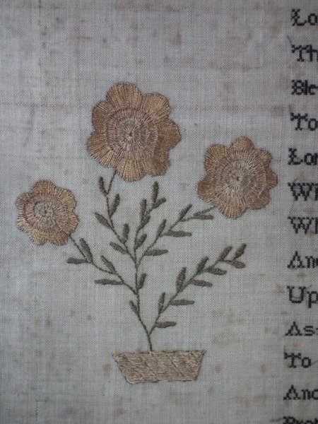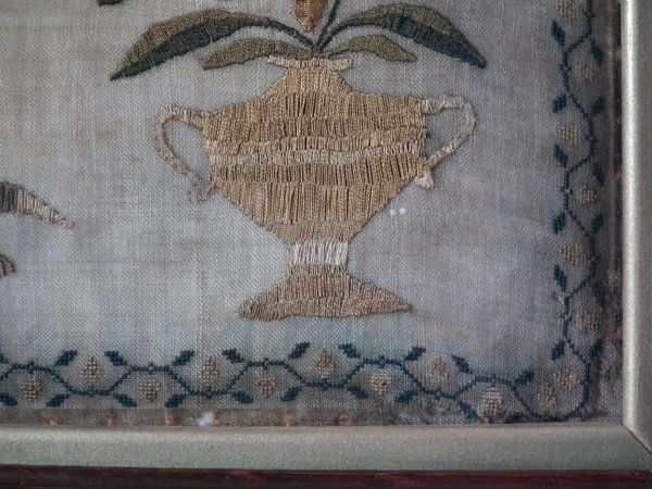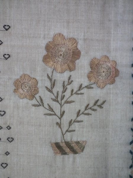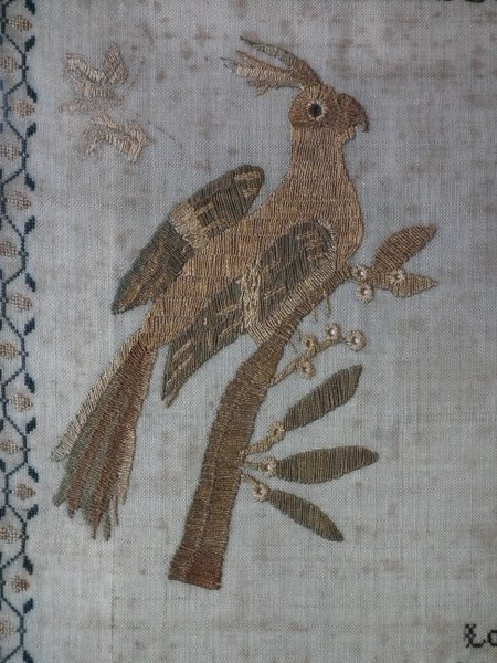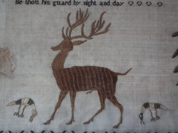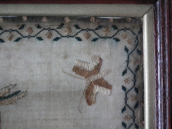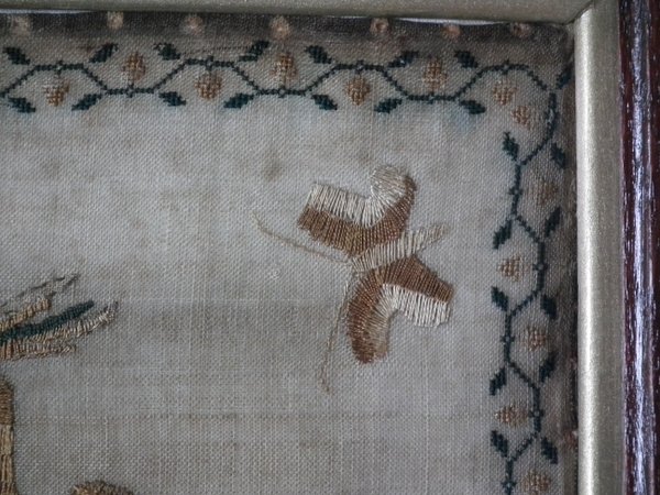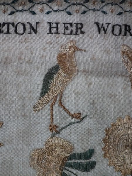 The sampler is worked in silk on linen ground, in a variety of stitches.