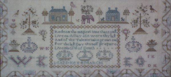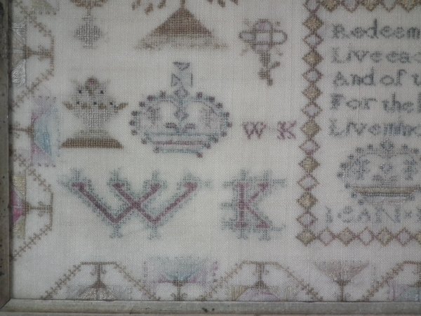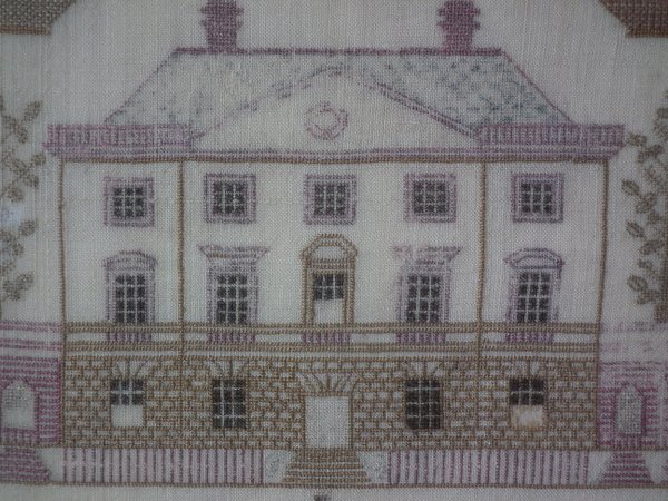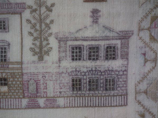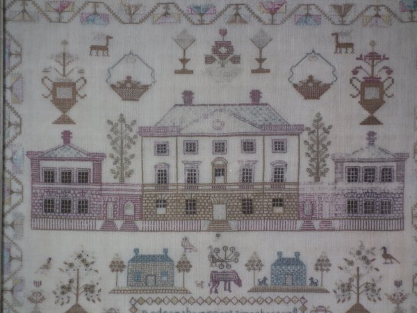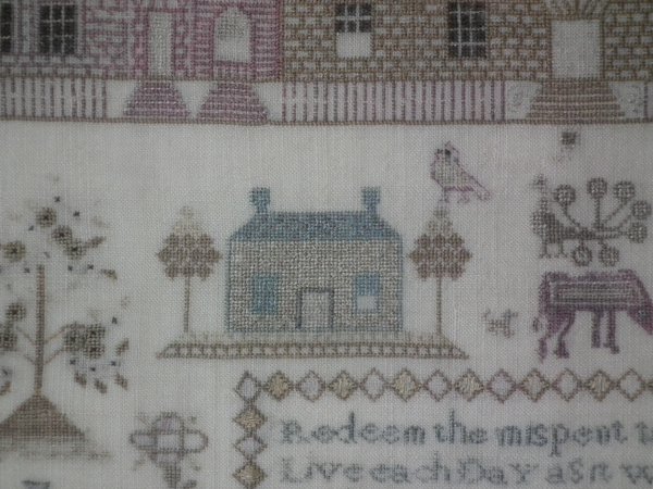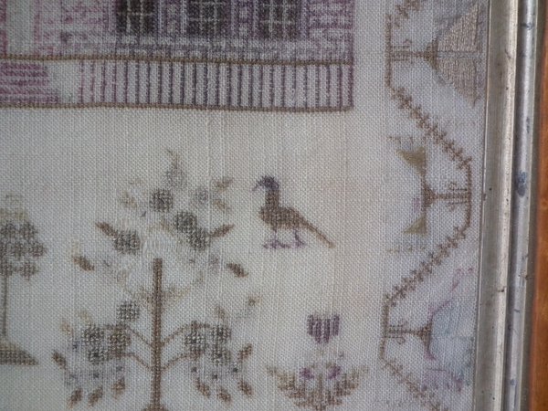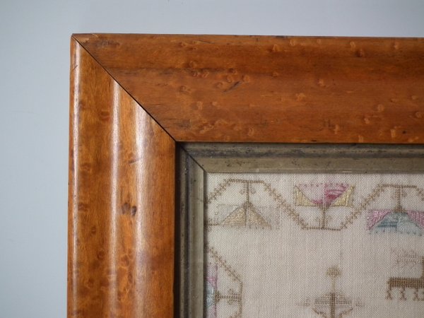 Victorian, circa 1840. 16ins by 15.75ins wide. Antique Country House Sampler, by Jean Key. Framed in an old maple frame with glass.
