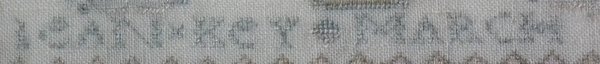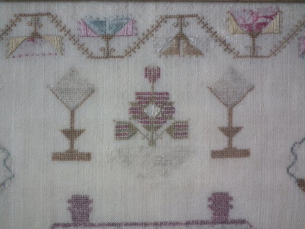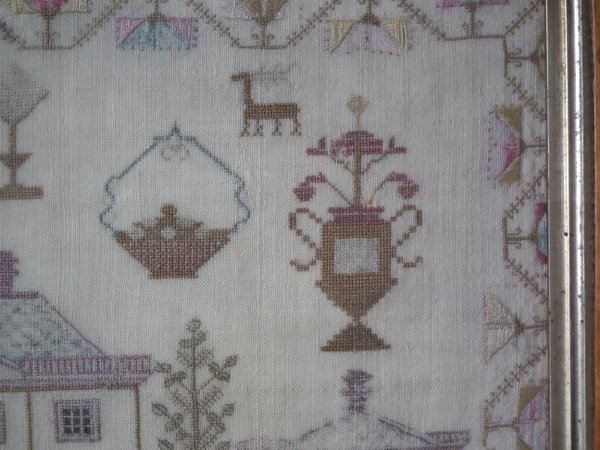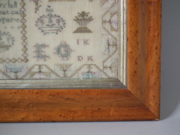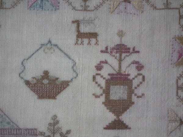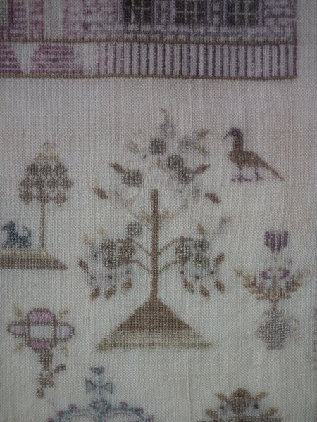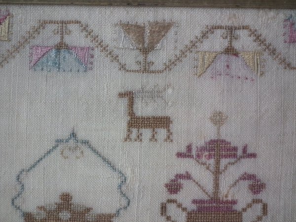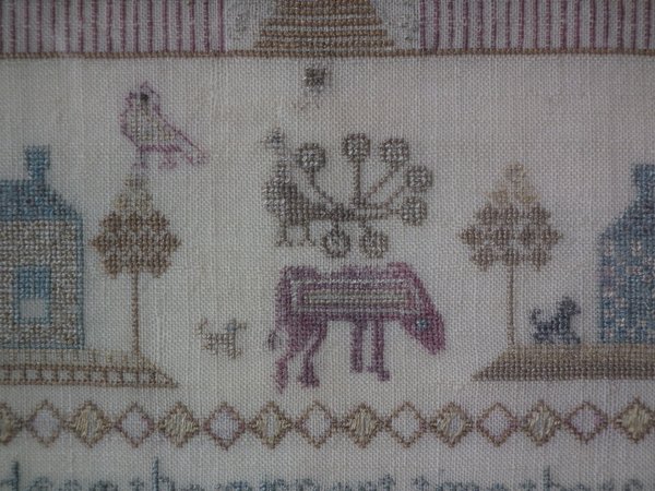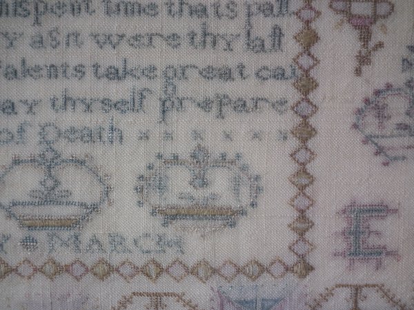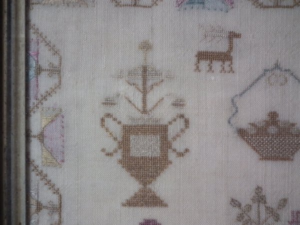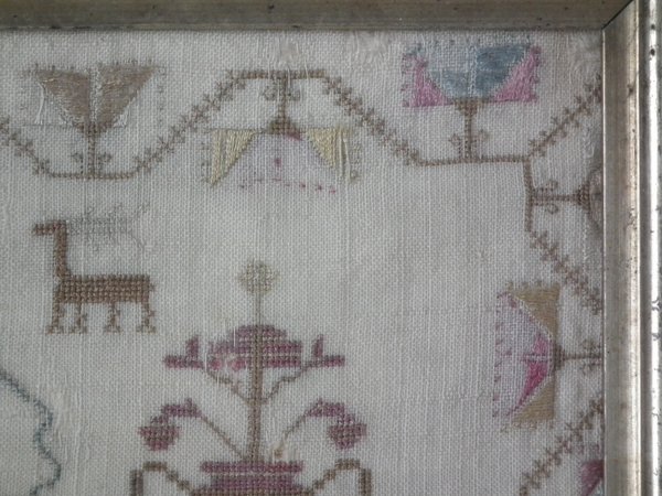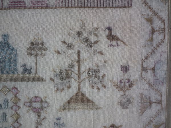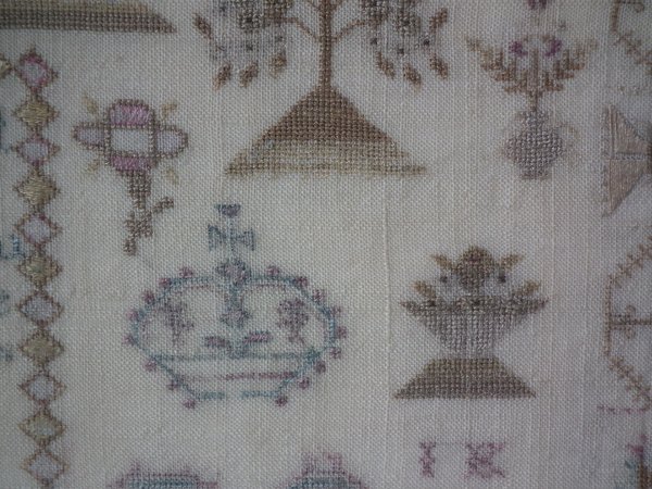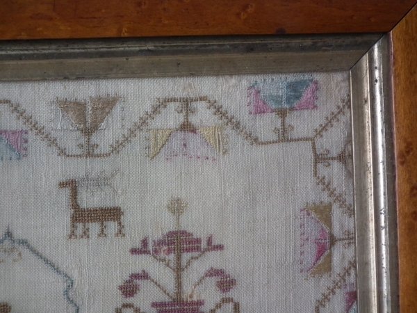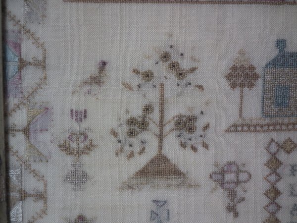 The sampler is worked in silk on linen ground, in a variety of stitches.