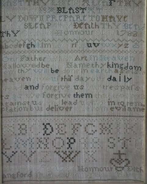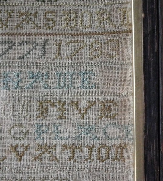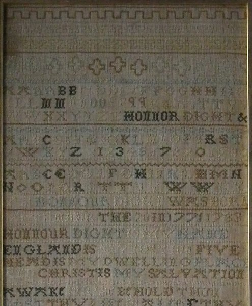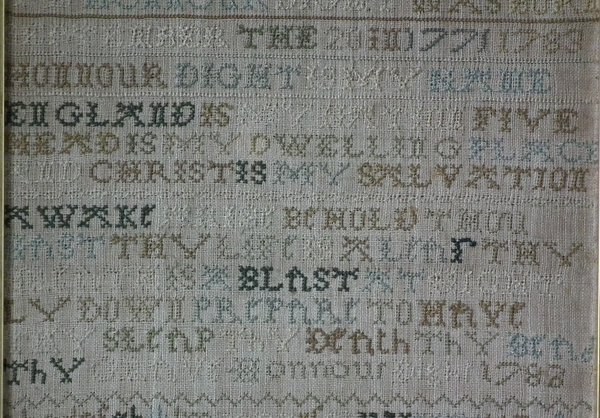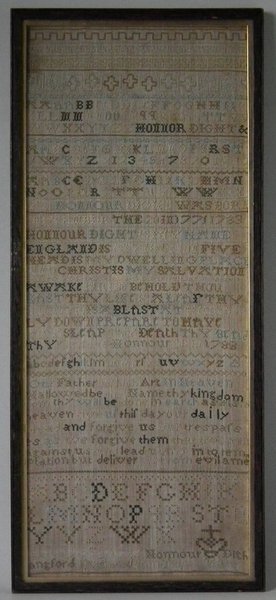 George III, dated 1783. 25.25ins by 10.25ins wide. 1783 Verse Sampler by Honnour Dight. Framed in an old wood frame with rippled, old glass.