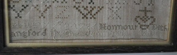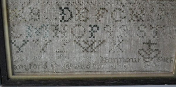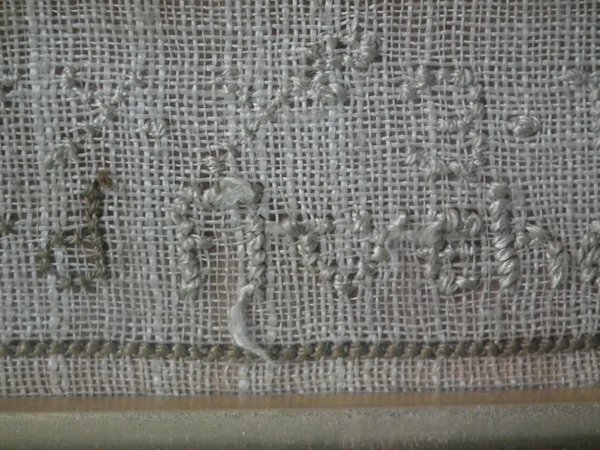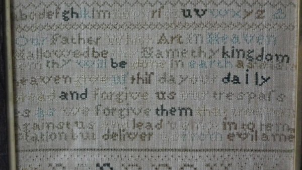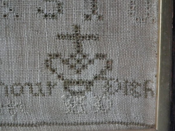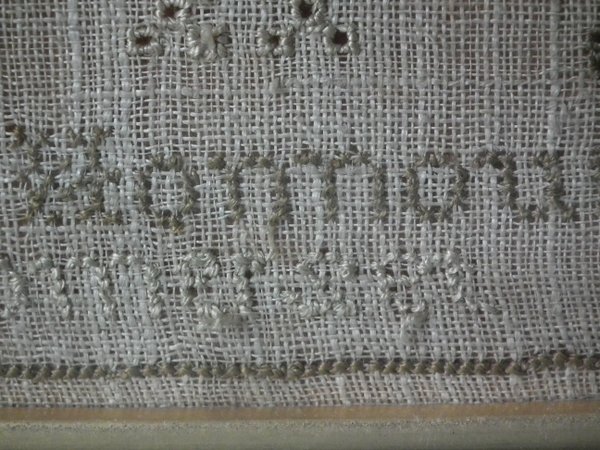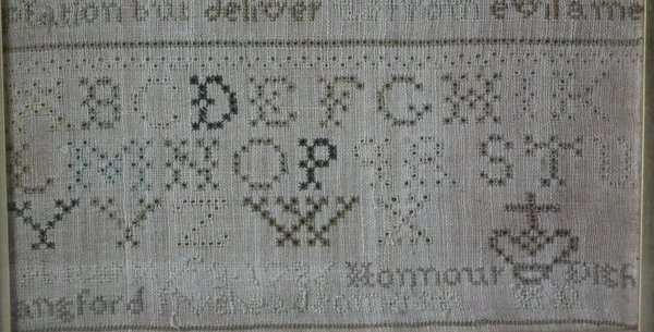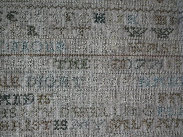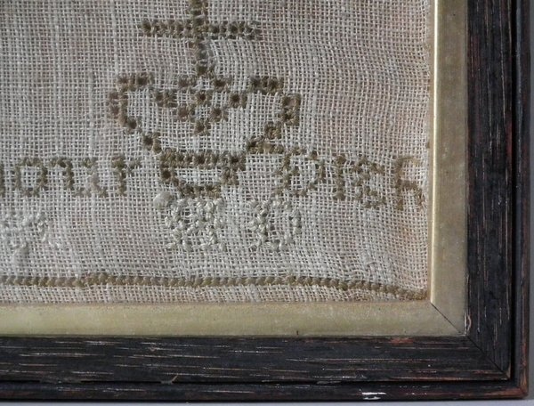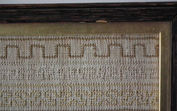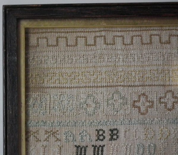 The sampler is worked in silk on linen ground, in cross stitch and Algerian eye.