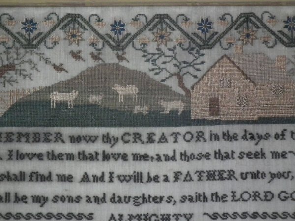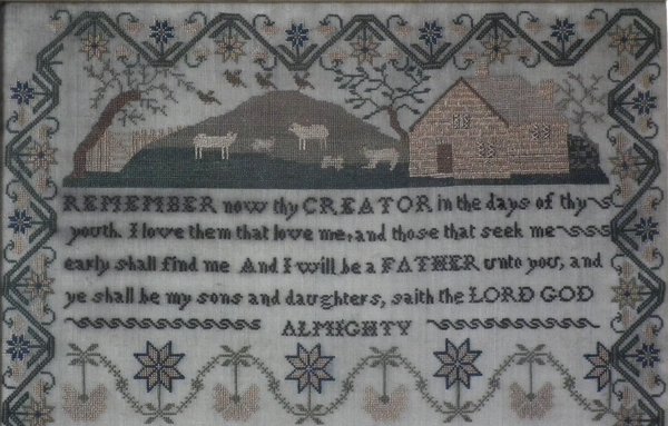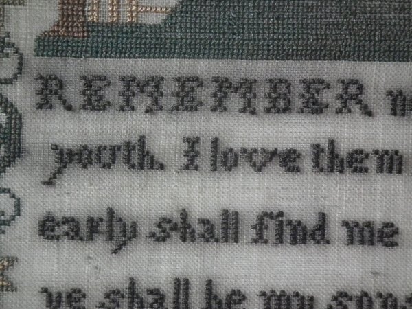 The sampler is worked in silk on linen ground, in cross stitch throughout.
