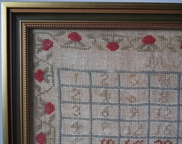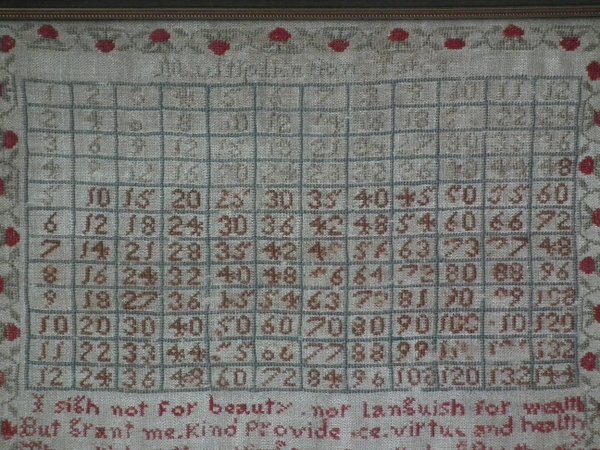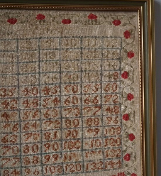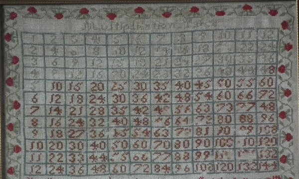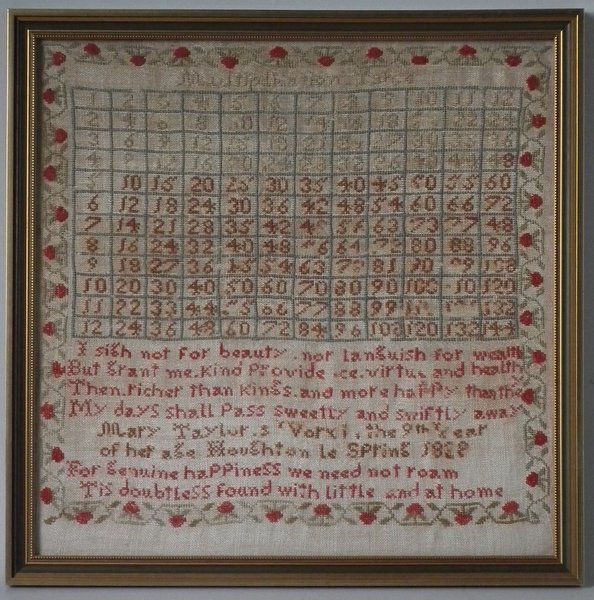 Victorian, dated 1838. 14.75ins high by 14.75ins wide. 1838 Multiplication Table Sampler by Mary Taylor. Framed in a modern, gilt over wood, frame with non-reflective glass.