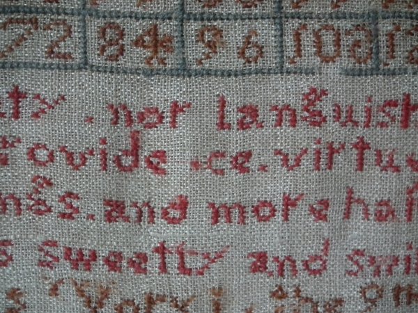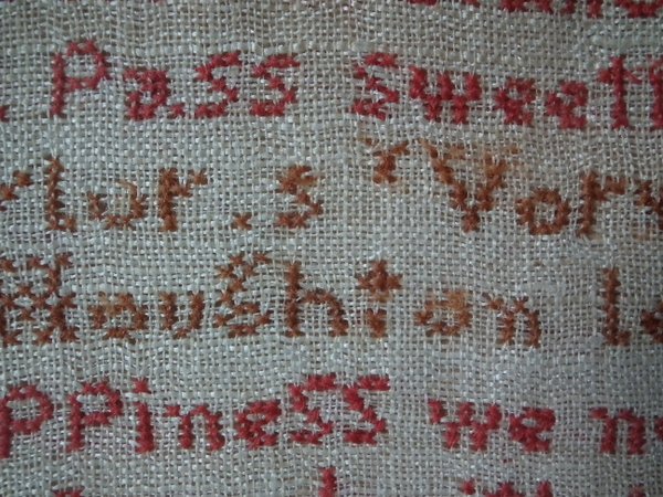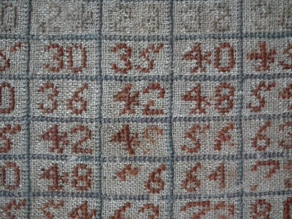 CONDITION: Good. No holes. No stains. Some stitch losses to the verse, signature, numbers and grid.