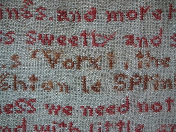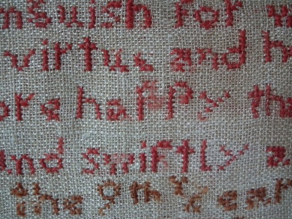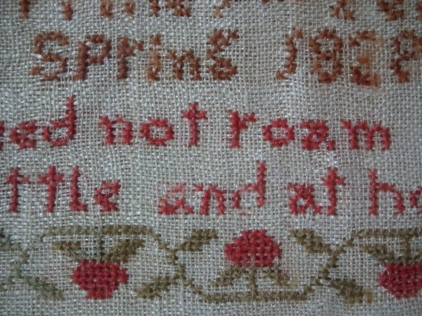 The sampler is worked in wool on canvas ground, in cross stitch throughout.