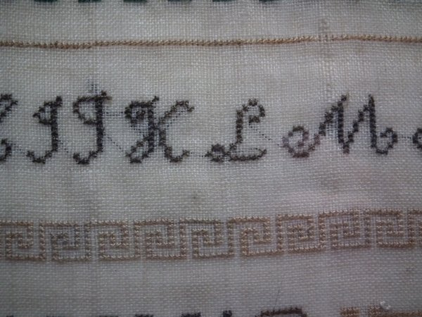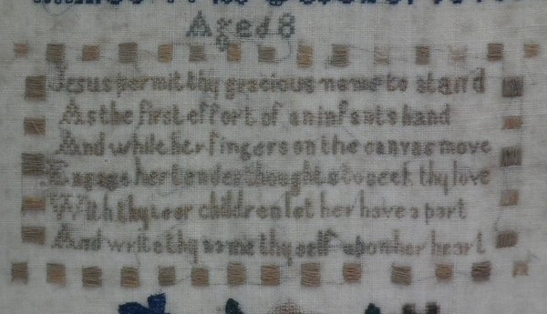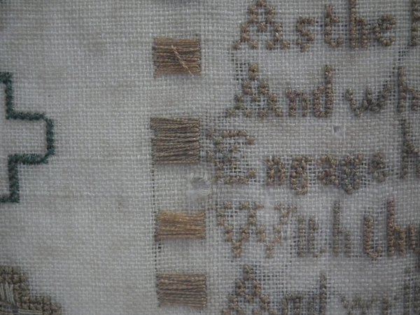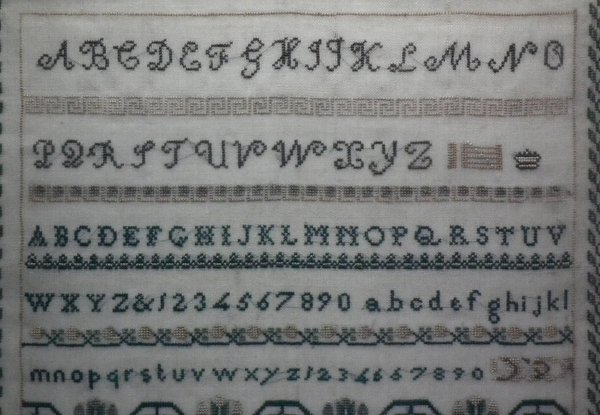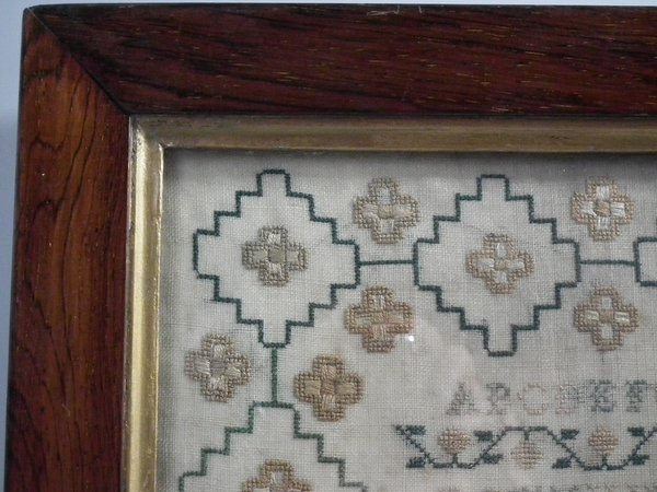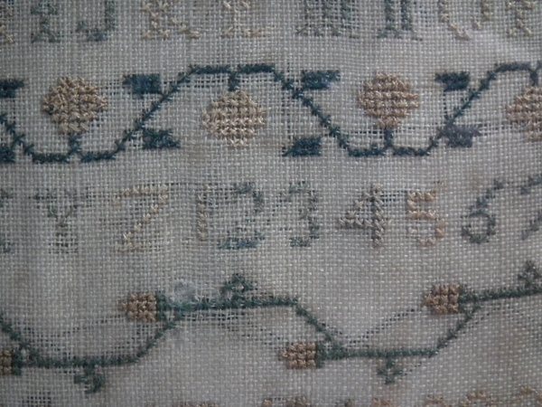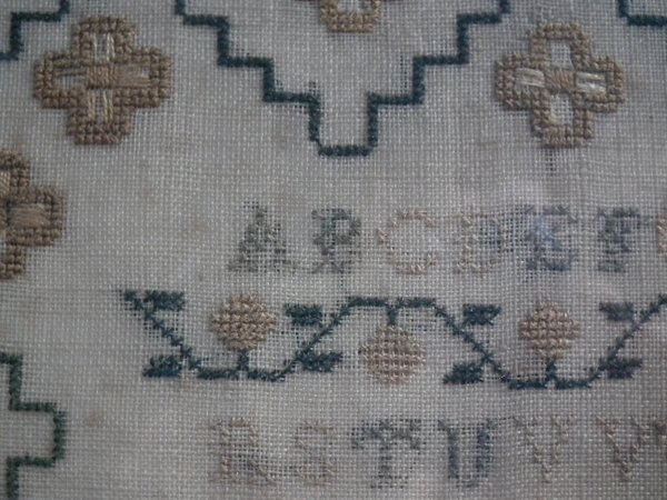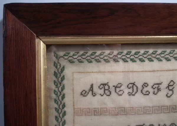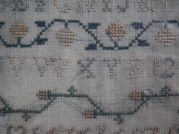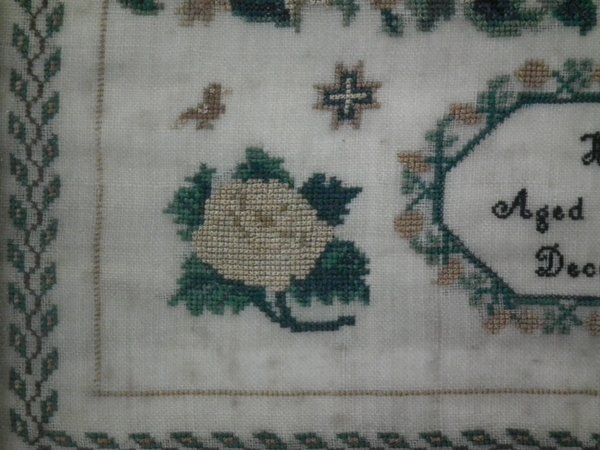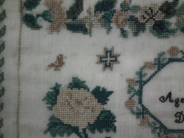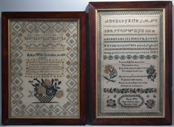 The samplers are worked in silk on linen ground, in cross stitch and Algerian eye.