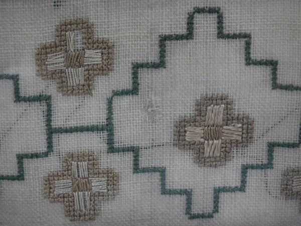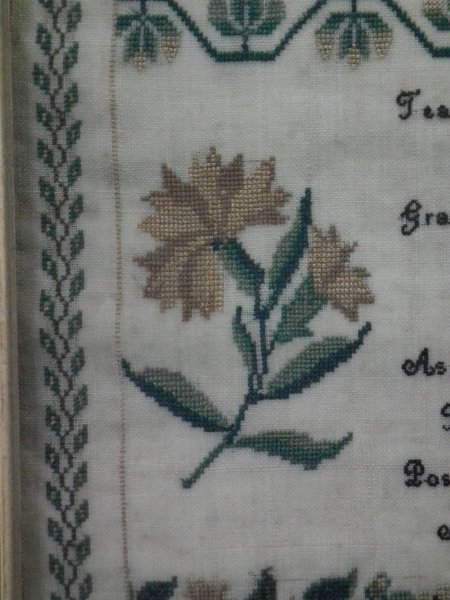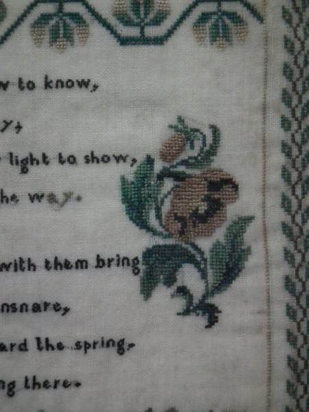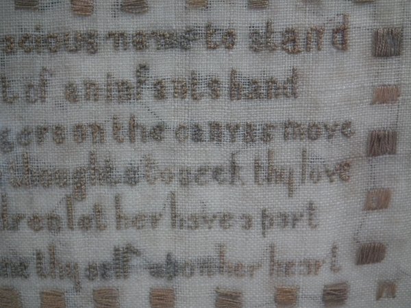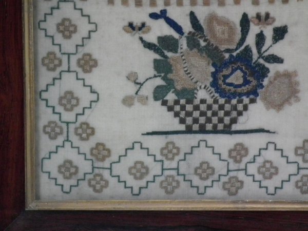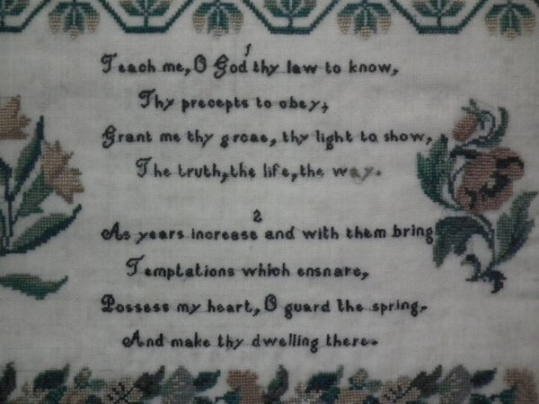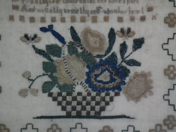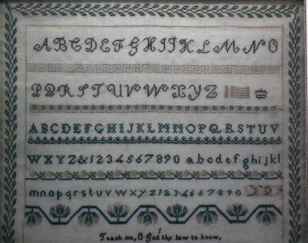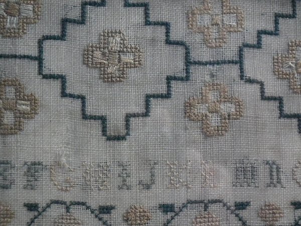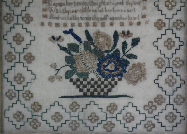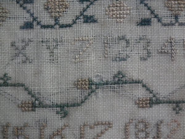 The samplers are worked in silk on linen ground, in cross stitch and Algerian eye.
