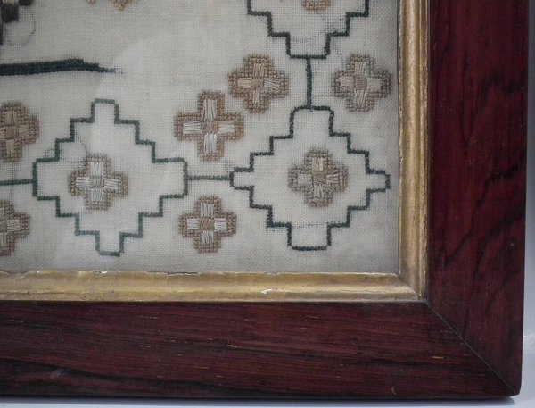 William IV, dated 1835. Hannah 18ins by 12ins, Allice 16.5ins by 11.75ins. Pair 1835 and 1843 Sister Samplers by Allice and Hannah Witt. Framed in old wood frames with gilt slip and glass.