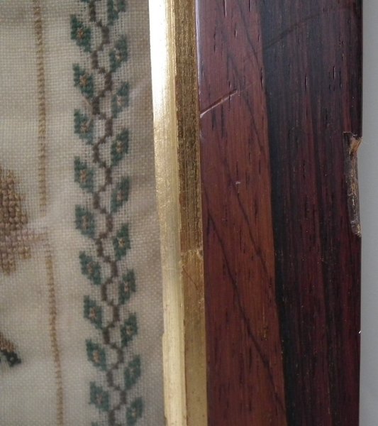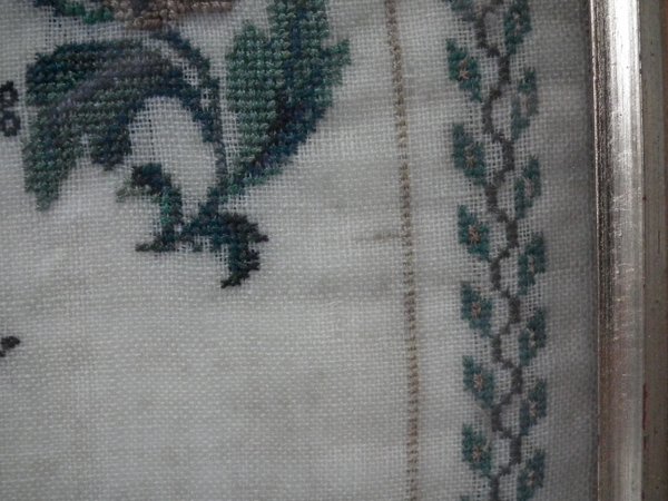 No stitch loss. Colours are all good and strong with no noticeable fading. No colour run. Neatly and evenly stretched. Frame showing slight wear but in good condition, ready to hang.