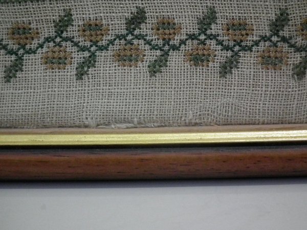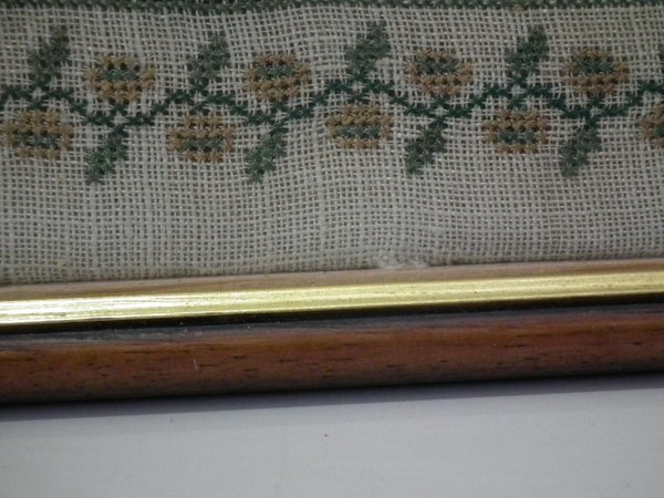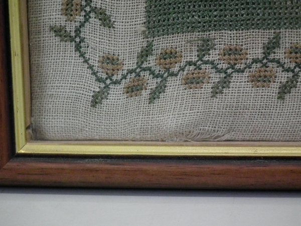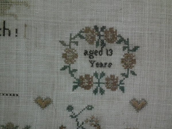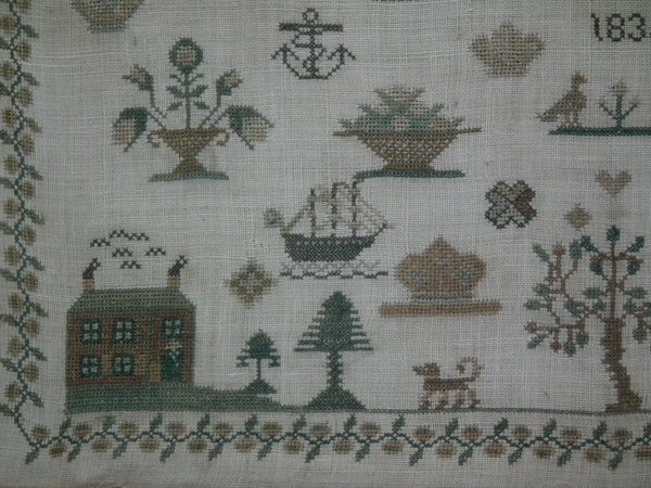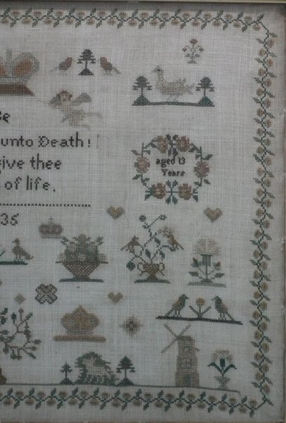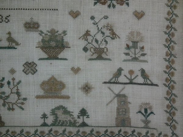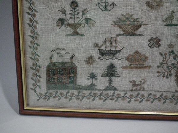 The sampler is worked in silk on linen ground, in a variety of stitches.