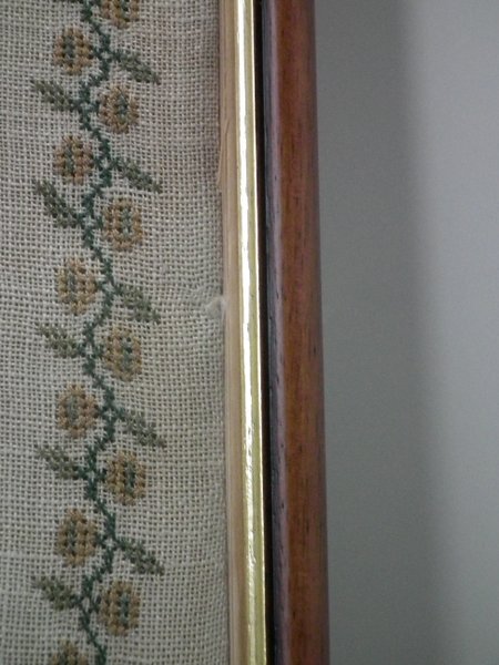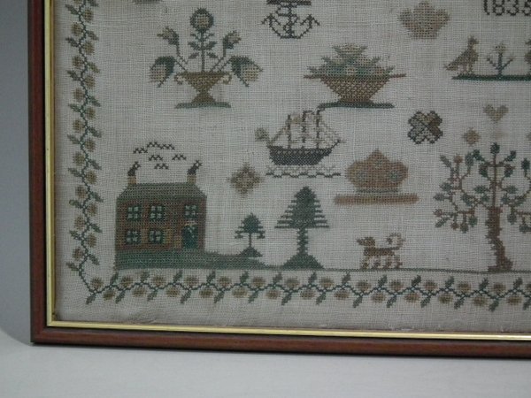 William IV, dated 1835. 15.25 ins high by 20.5ins wide. 1835 Sampler by Mary Hawkins. Framed in a modern wood frame with gilt slip and glass.