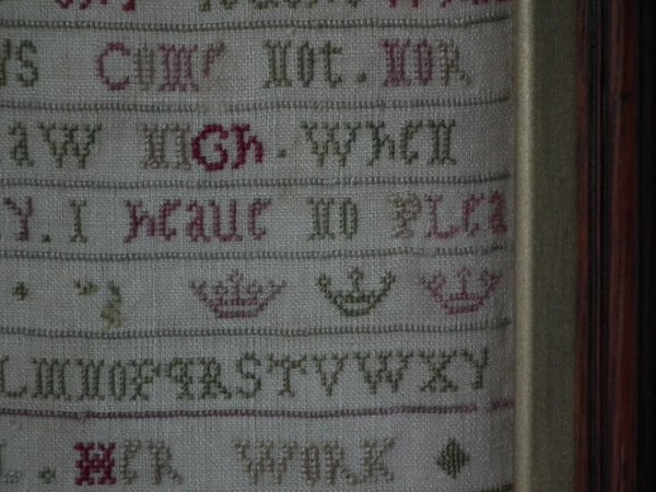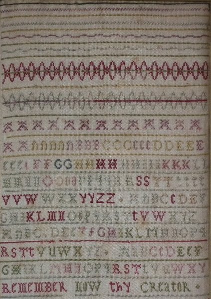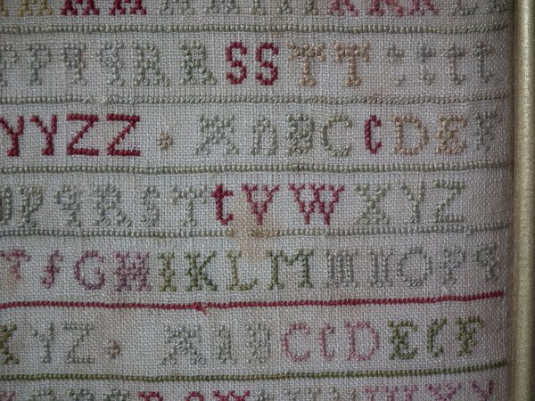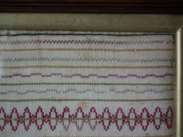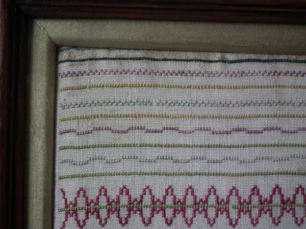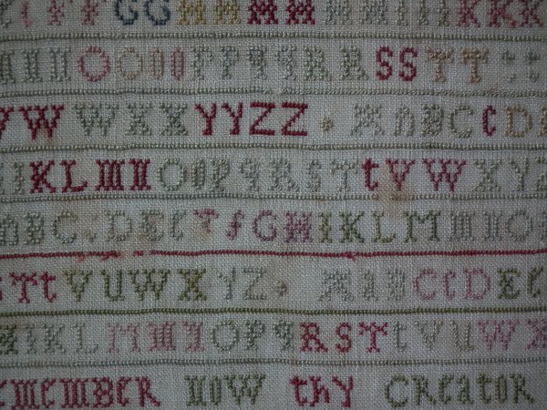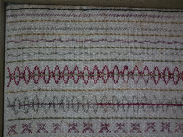 The sampler is worked in silk on linen ground, in cross stitch throughout.