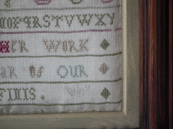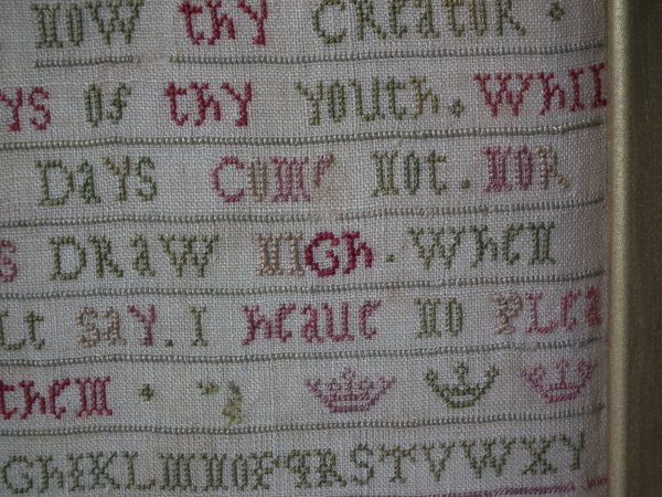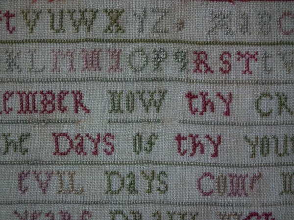 Some stitch losses to the divider lines, letters, verse, signature and motifs.