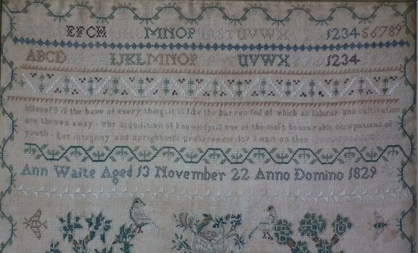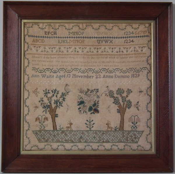 George IV, dated 1829. 17ins by 16.5ins wide. 1829 Sampler by Ann Waite. Framed in an old wood frame with gilt slip and glass.