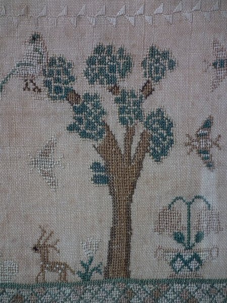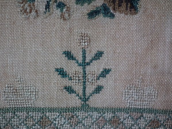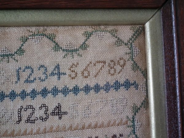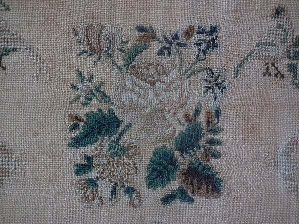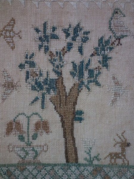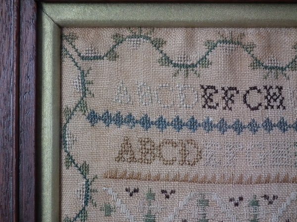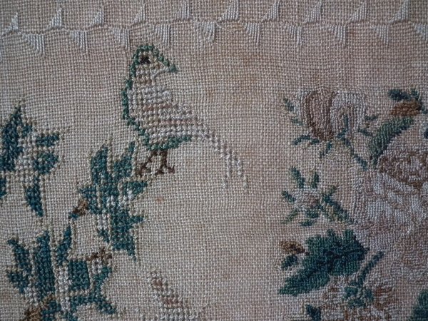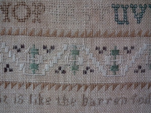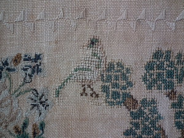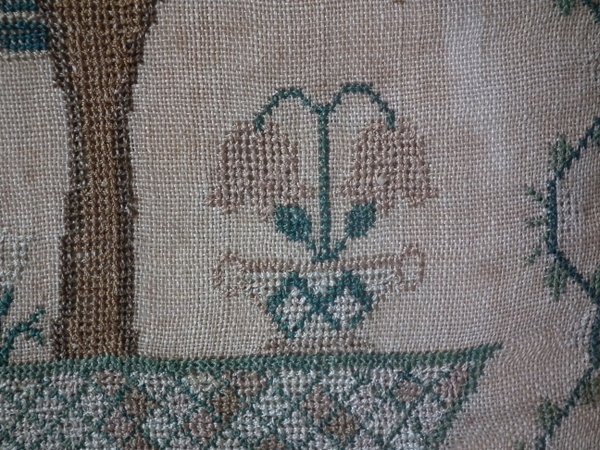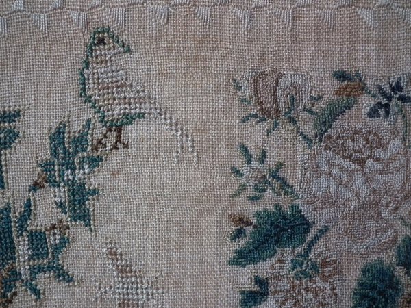 The sampler is worked in silk on linen ground, in a variety of stitches.