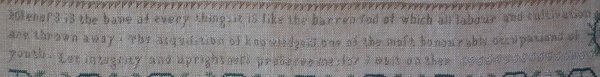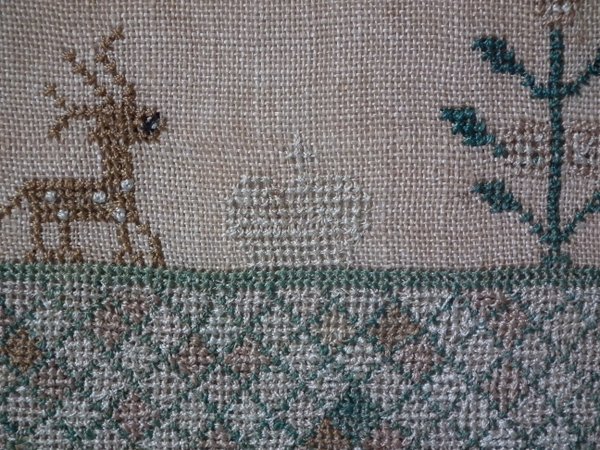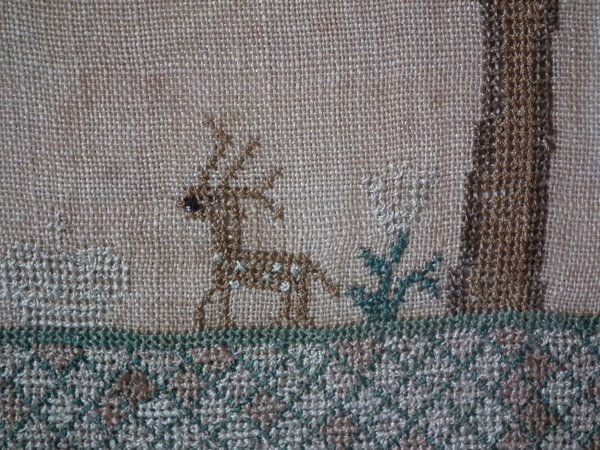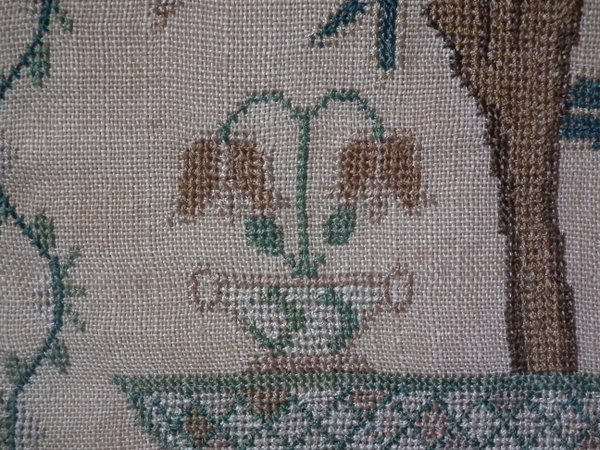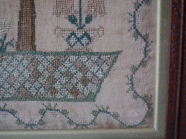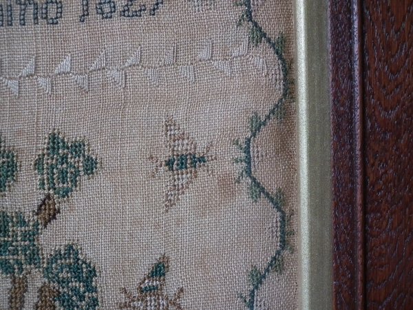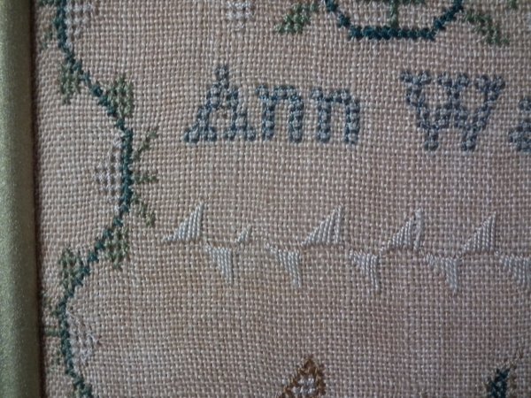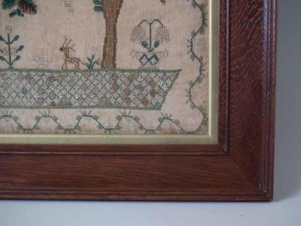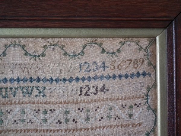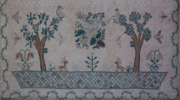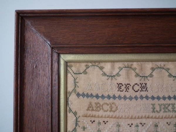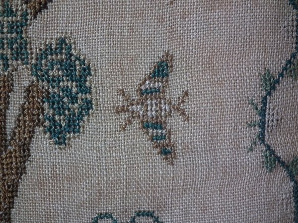 The sampler is worked in silk on linen ground, in a variety of stitches.