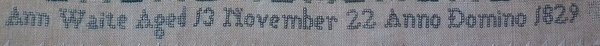 'Ann Waite Aged 13 November 22 Anno Domino 1829'.