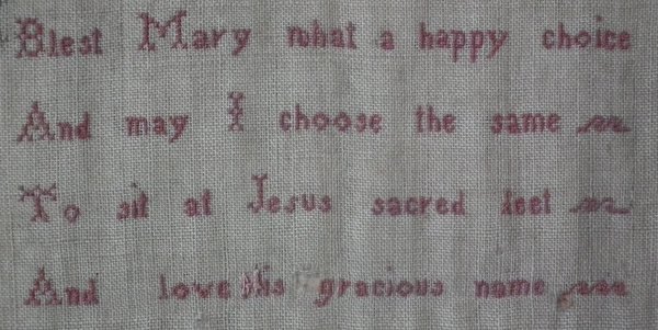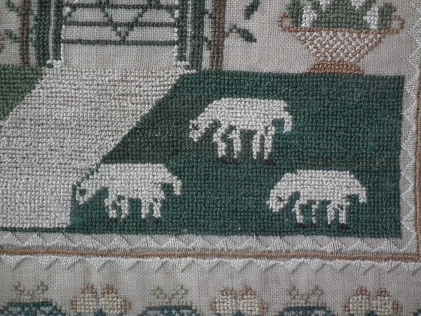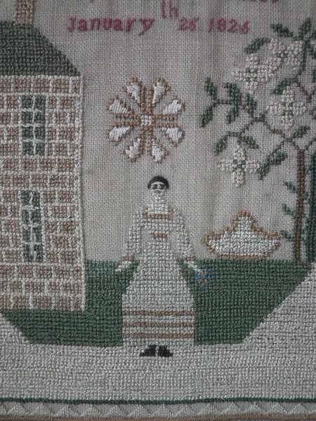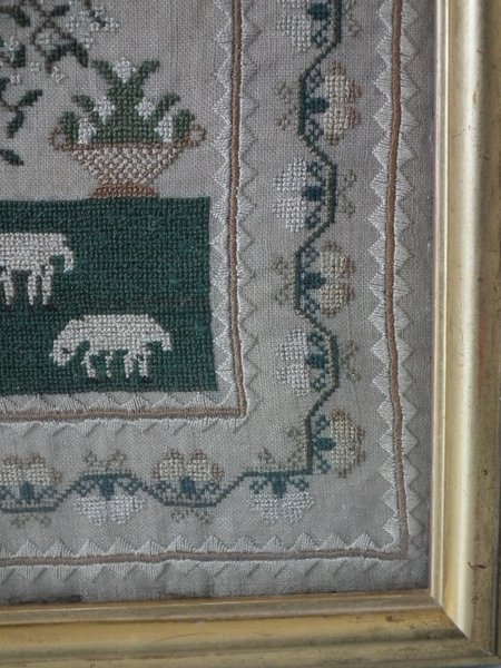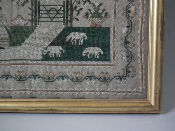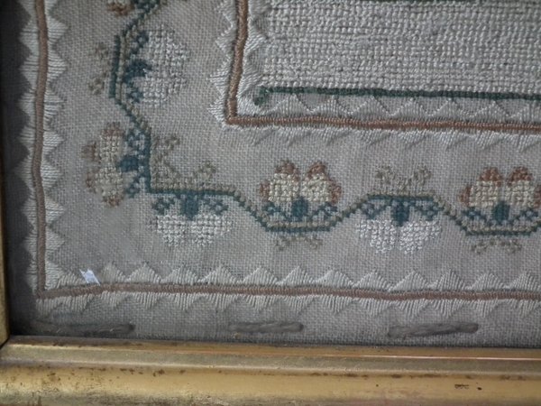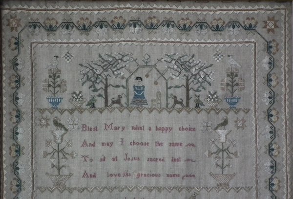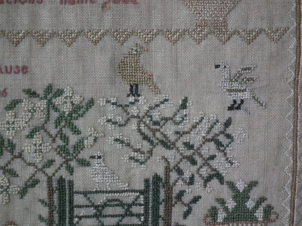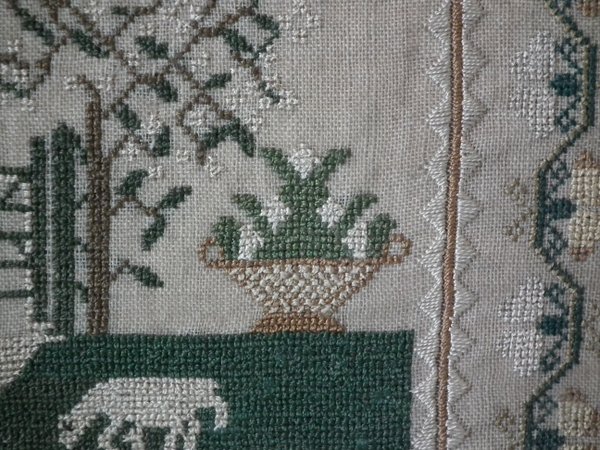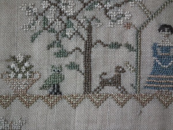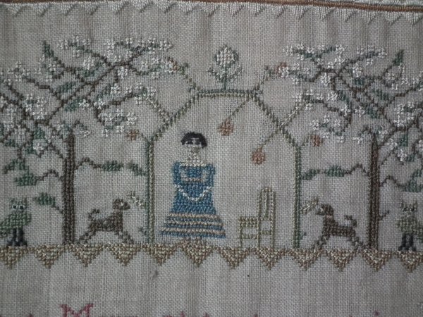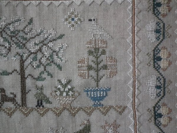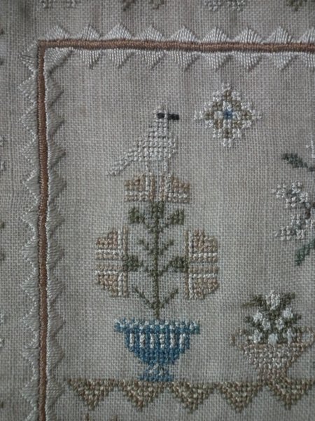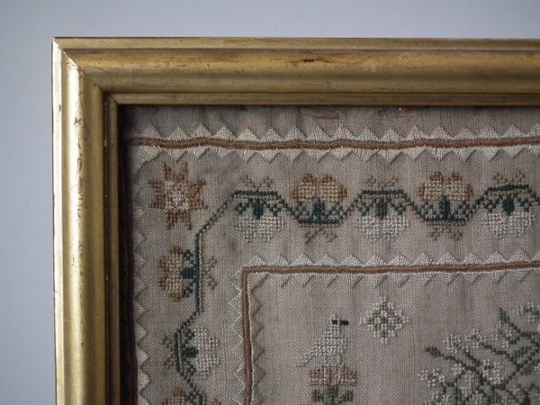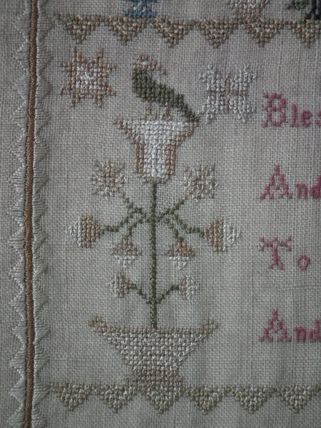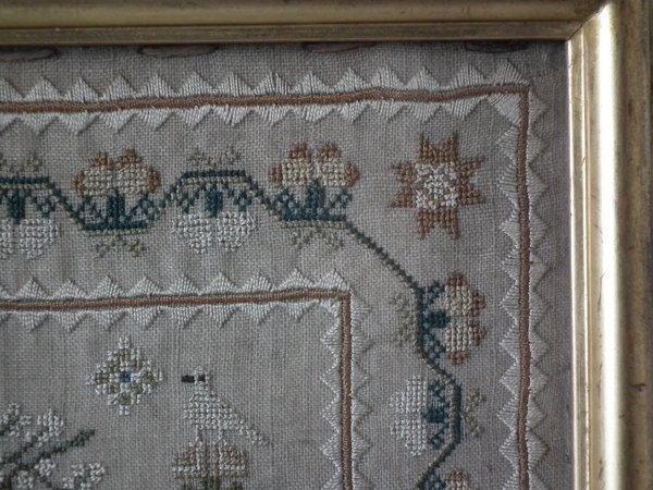 The sampler is worked in silk on linen ground, in a variety of stitches.