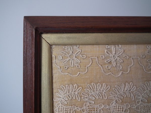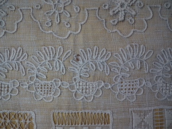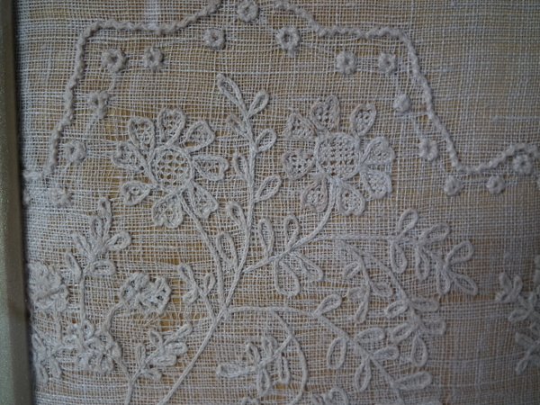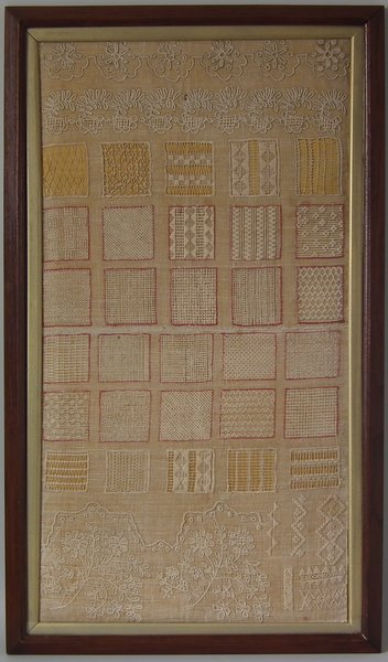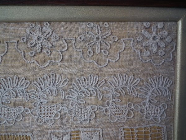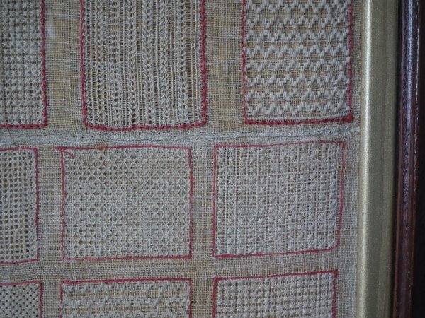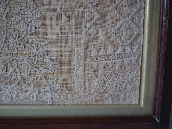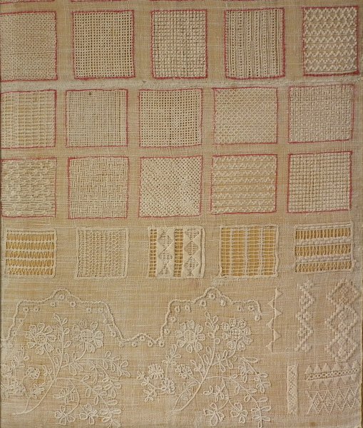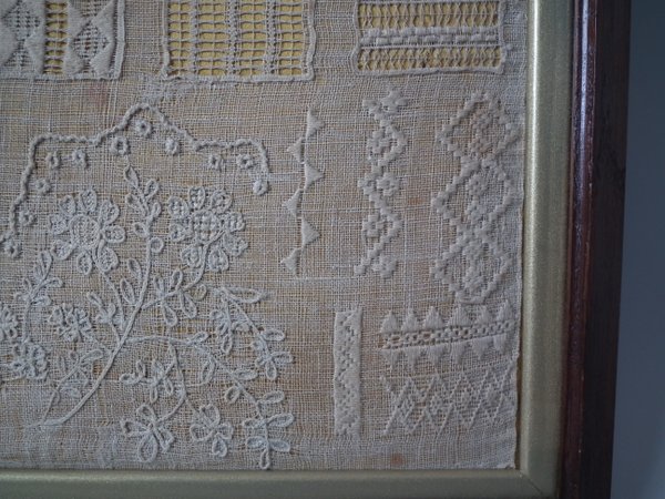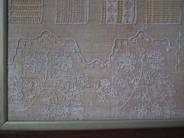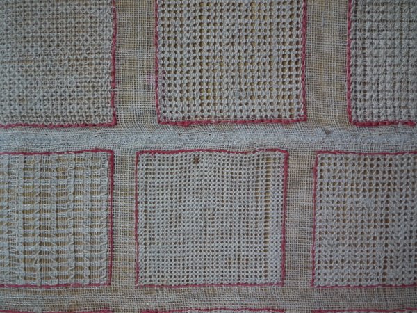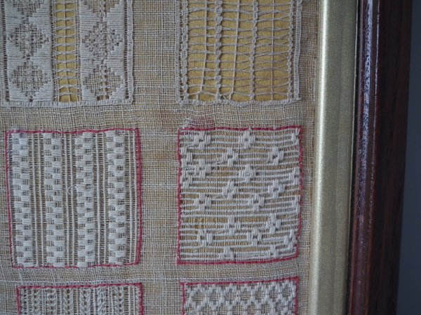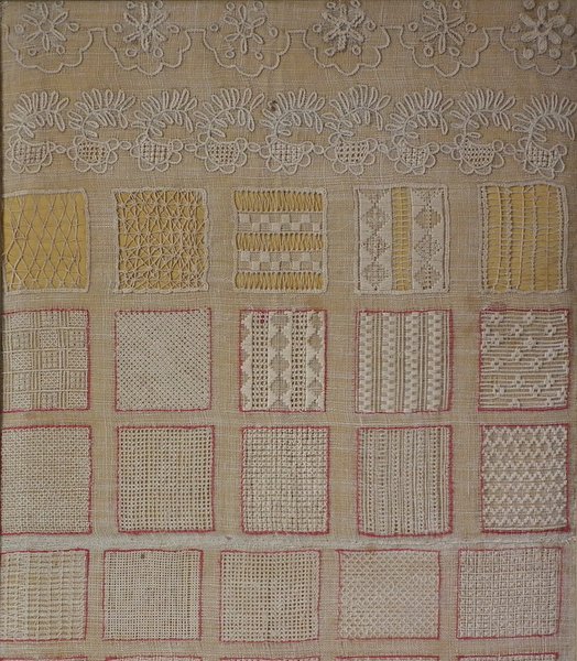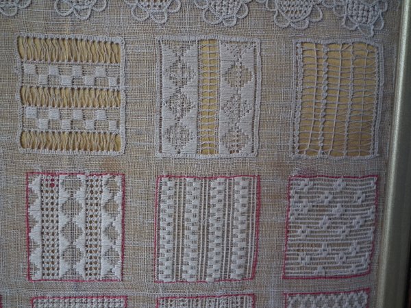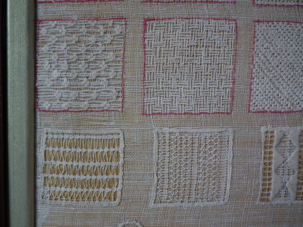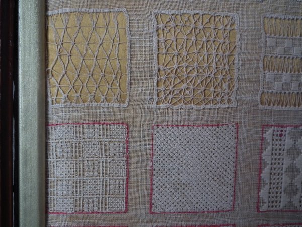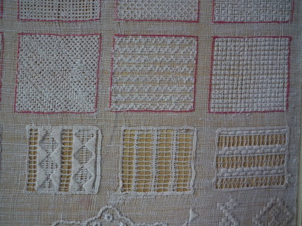 Square panels worked in a wonderful variety of stitches and techniques including cut and drawn work.