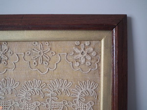 George III, circa 1800. 22.5ins high by 12ins wide. Circa 1800 Darning panel/sampler. Framed in an old wood frame with gilt slip and glass.