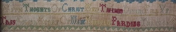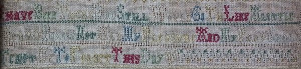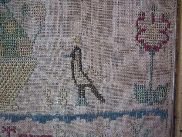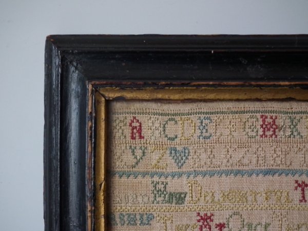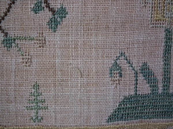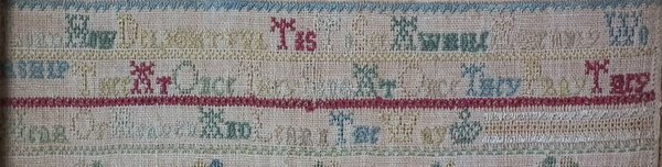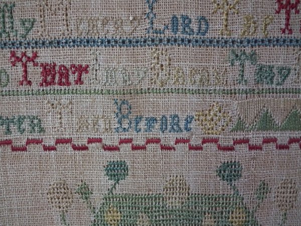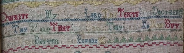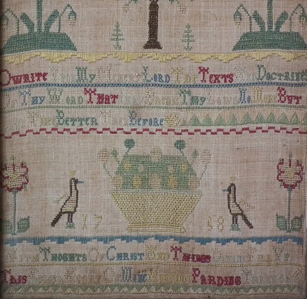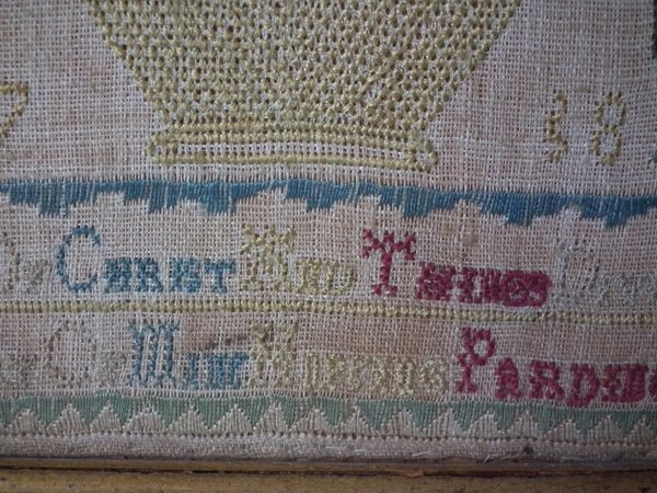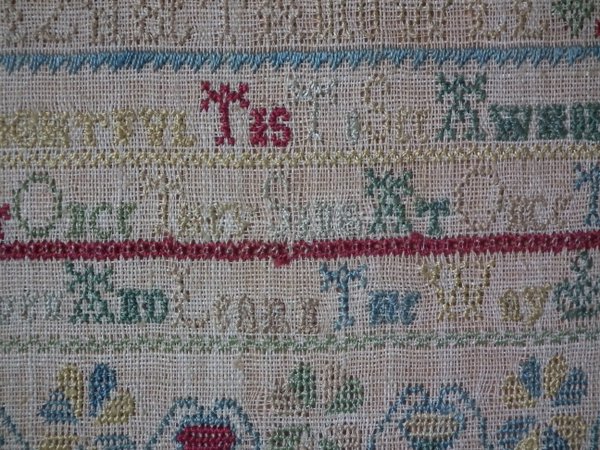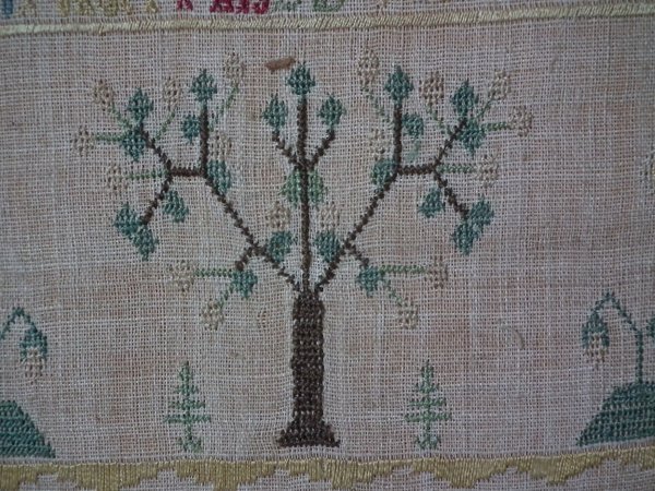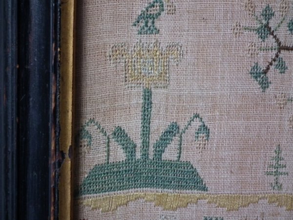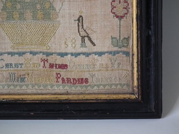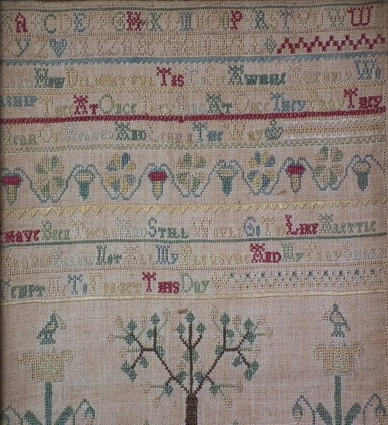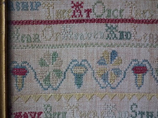 The sampler is worked in silk on canvas ground, in a variety of stitches including Algerian eye.