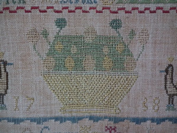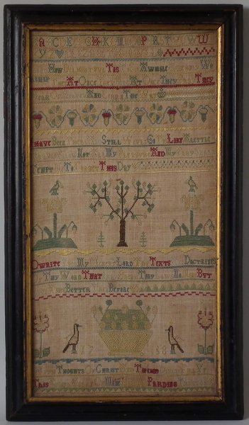 George II, dated 1758. 16.5ins high by 8.25ins wide. 1758 Sampler by Elizabeth Mowll. Framed in an old wood frame with rippled, old glass.