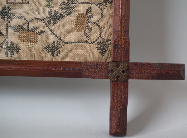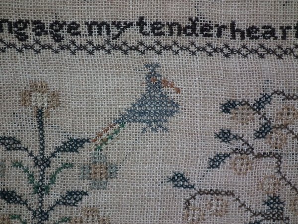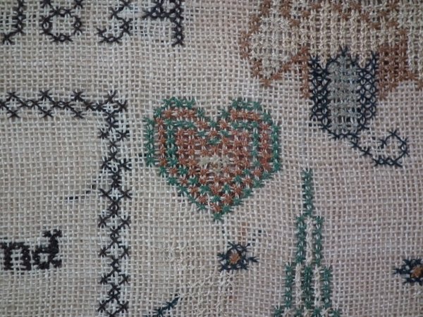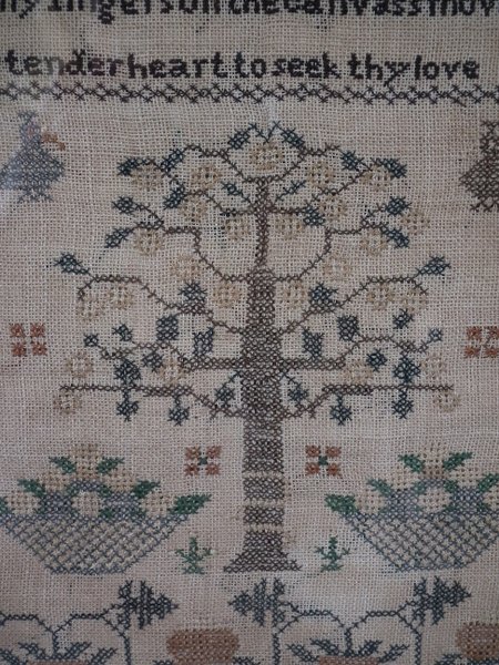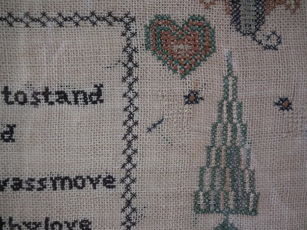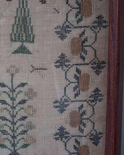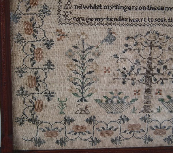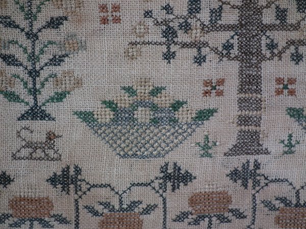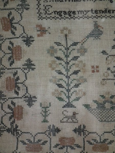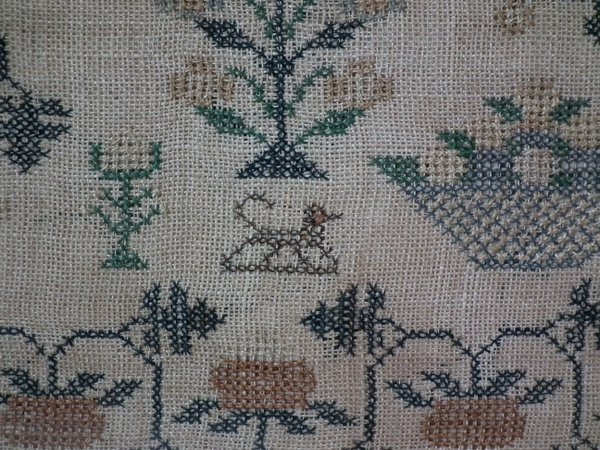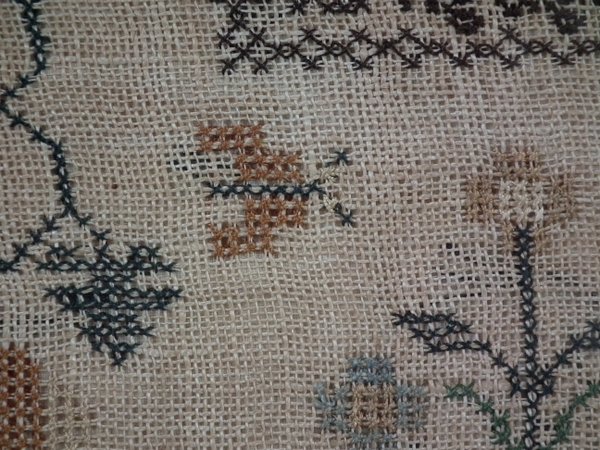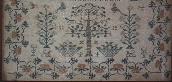 The sampler is worked in thread on a canvas ground, in cross stitch throughout.