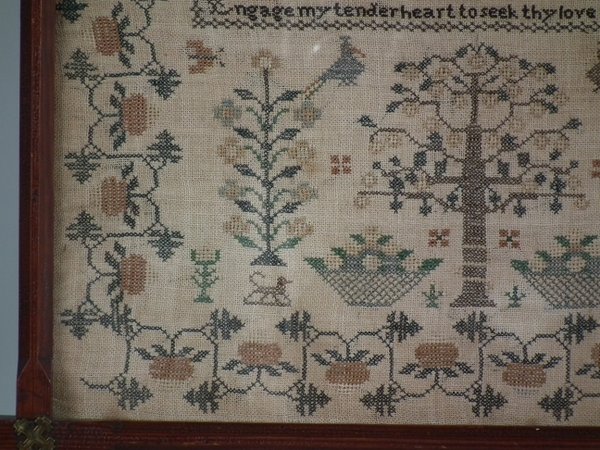 William IV, dated 1834. 14.5ins by 15.5ins wide. 1834 Sampler by Mary Farrall. Framed in an old wood frame with glass.