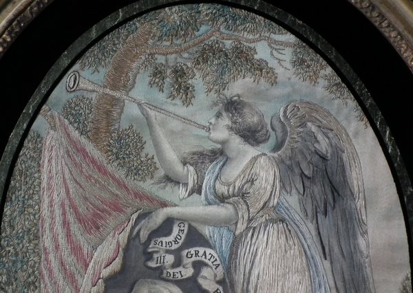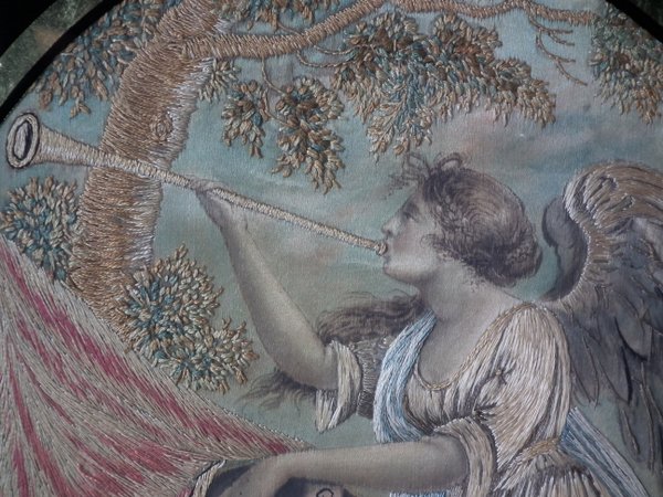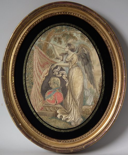 George III, Circa 1810. 10.5ins high by 8ins wide. Antique Georgian Silkwork Embroidery Picture, depicting George III and an Angel.