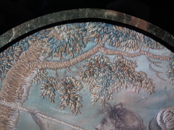The embroidery is worked in silk, on a silk ground, in a variety of stitches with painted details.