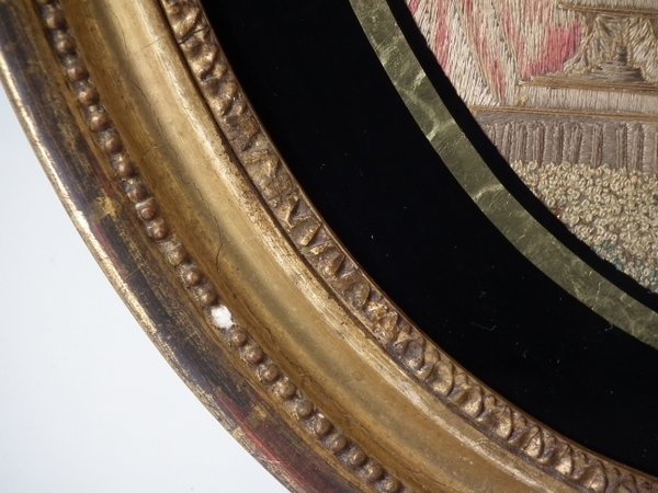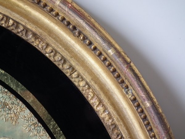 Framed in an old, possibly original, gilded, gesso frame. Rippled, old glass cover.