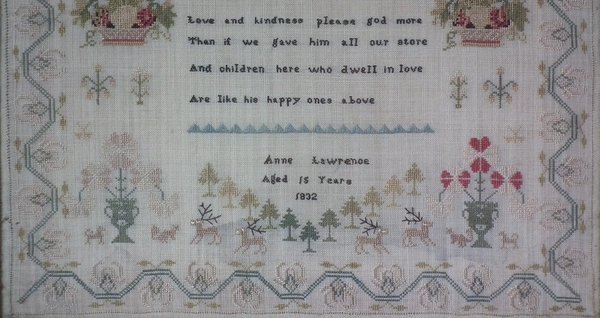 1832 Sampler by Anne Lawrence. Framed in an old wood frame with gilt slip and rippled, dimpled, old glass.