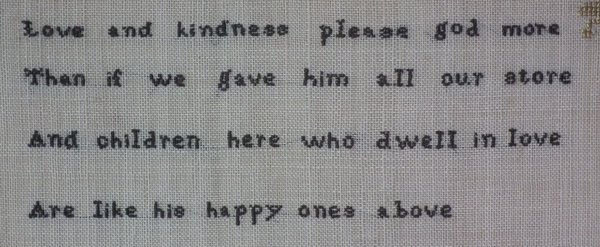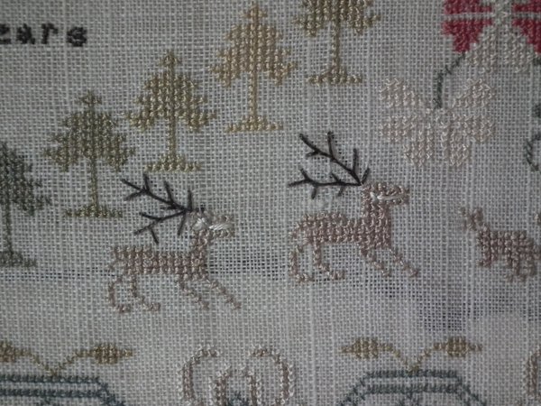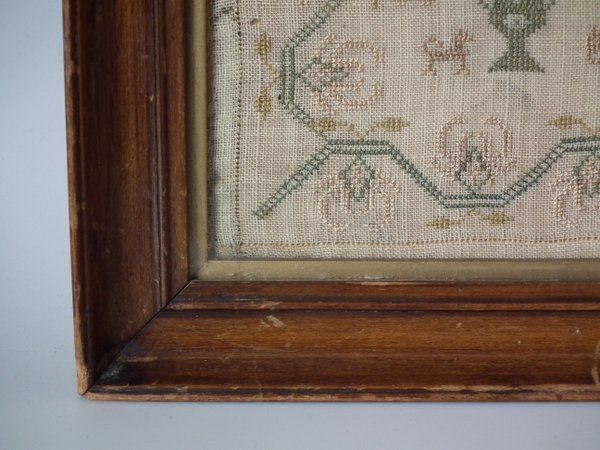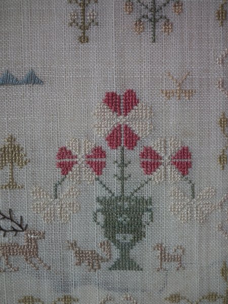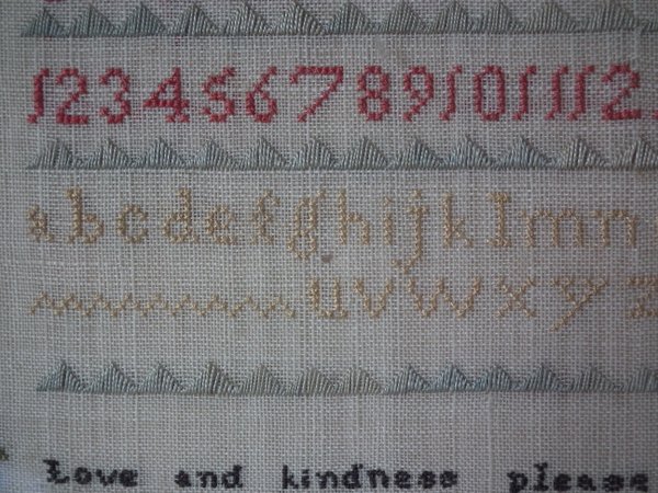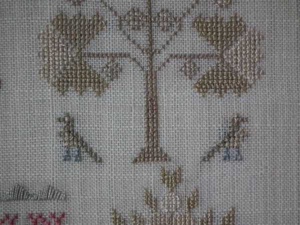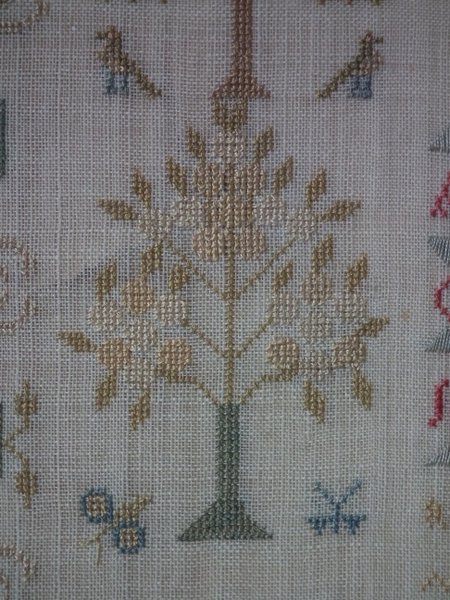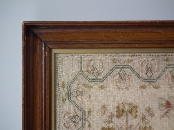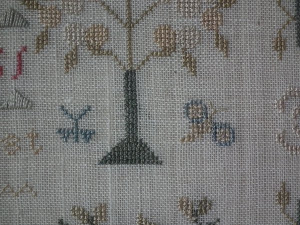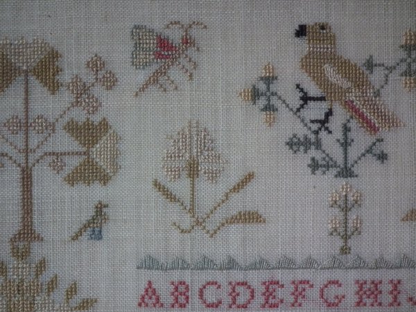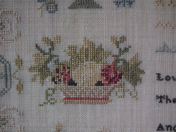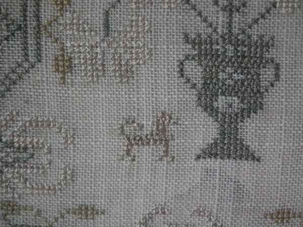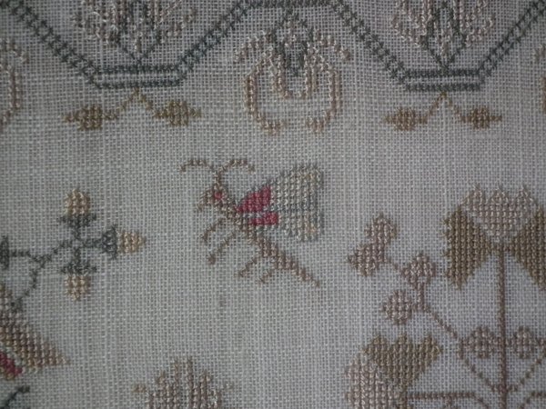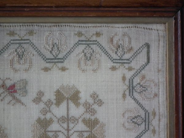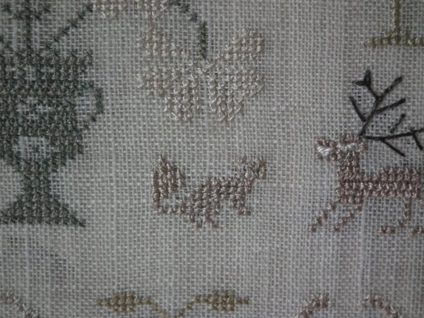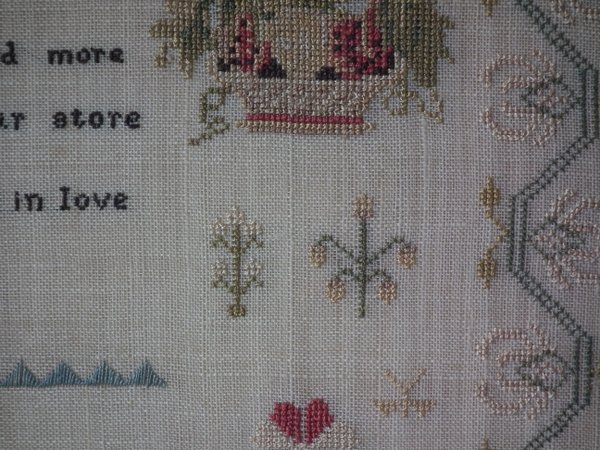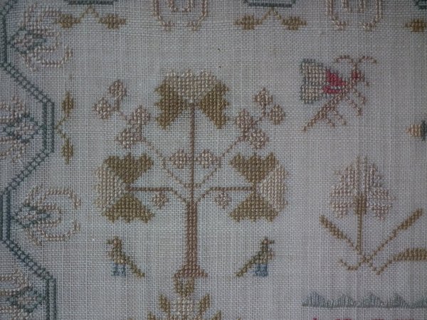 The sampler is worked in silk on linen ground, in a variety of stitches.