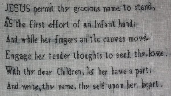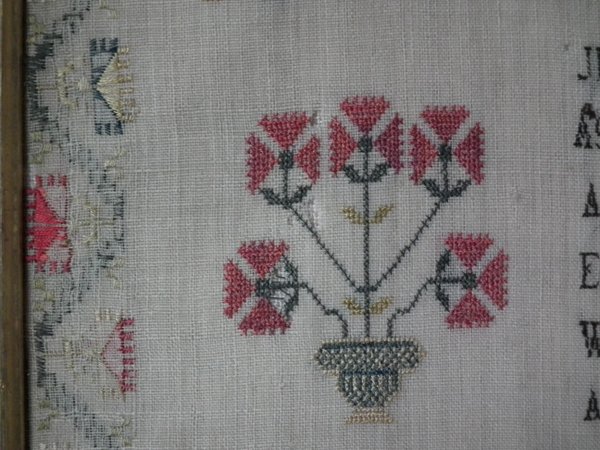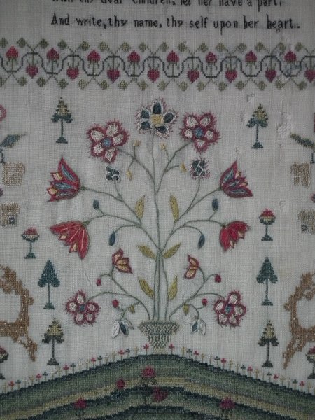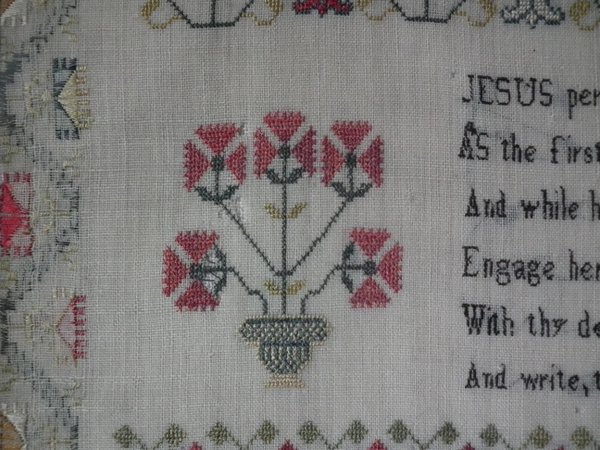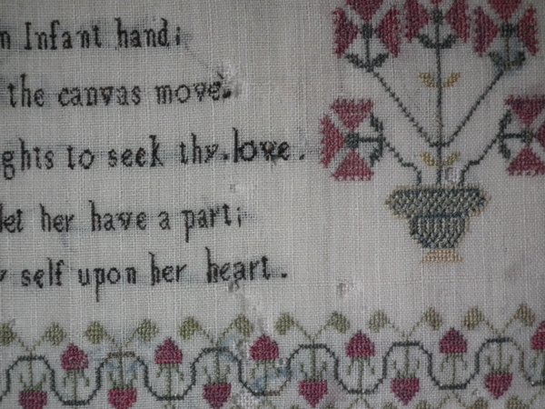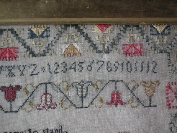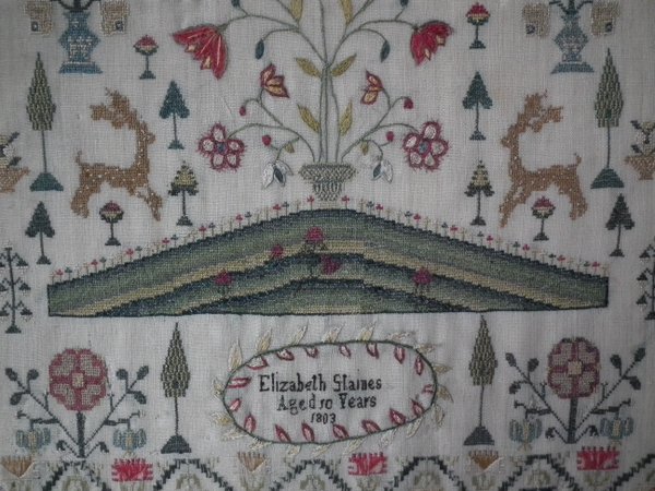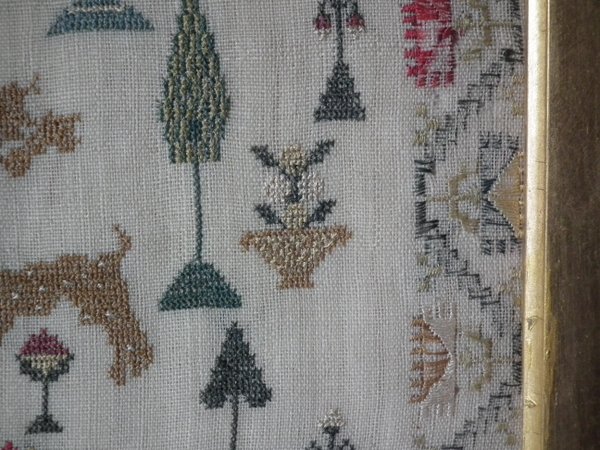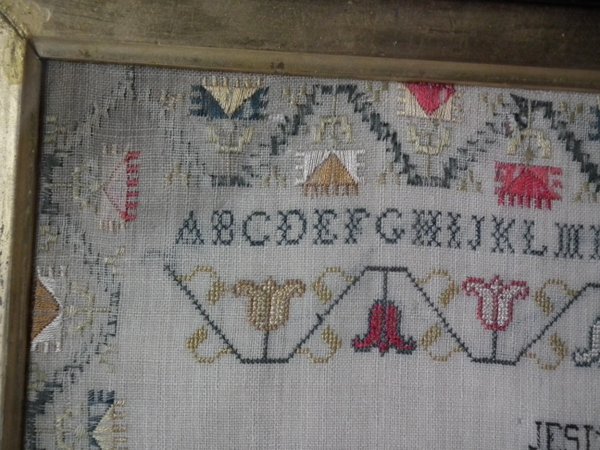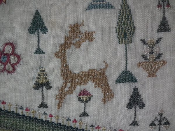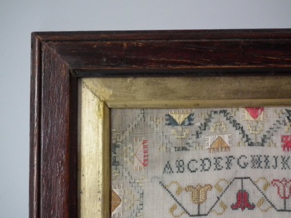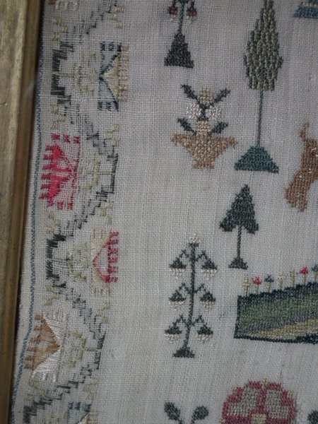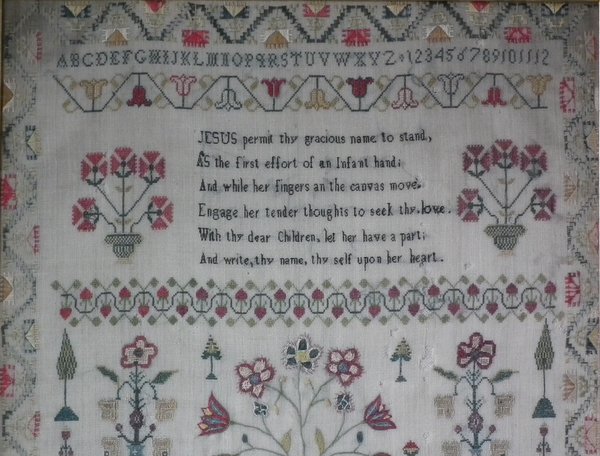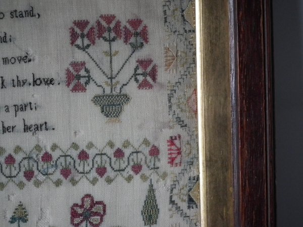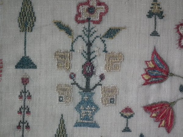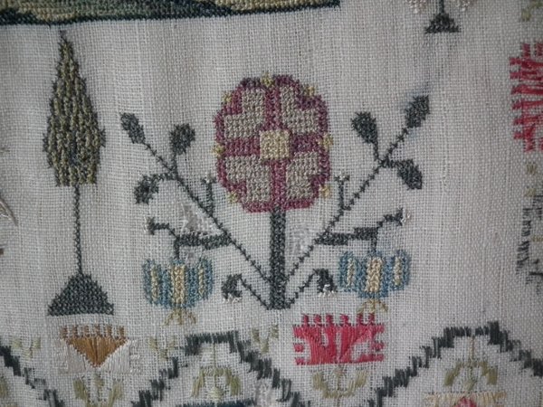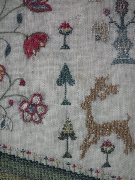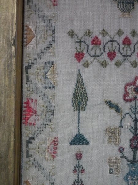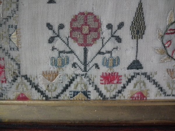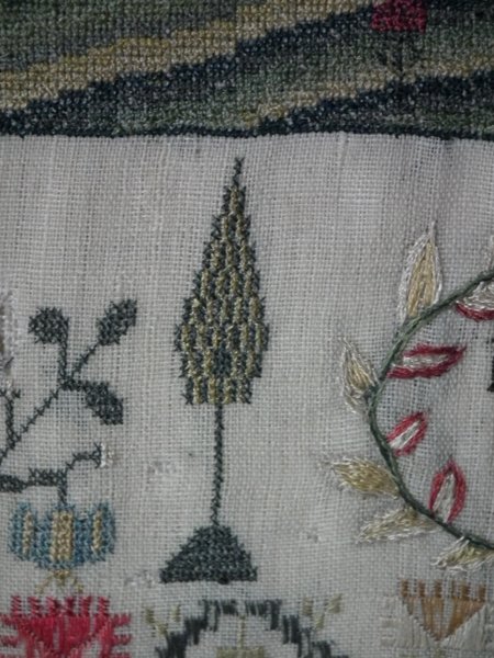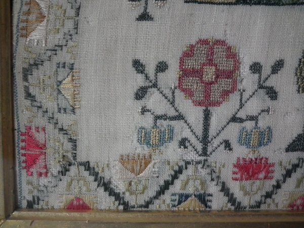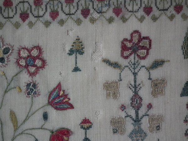 The sampler is worked in silk on linen ground, in a variety of stitches.
