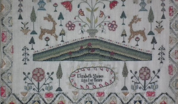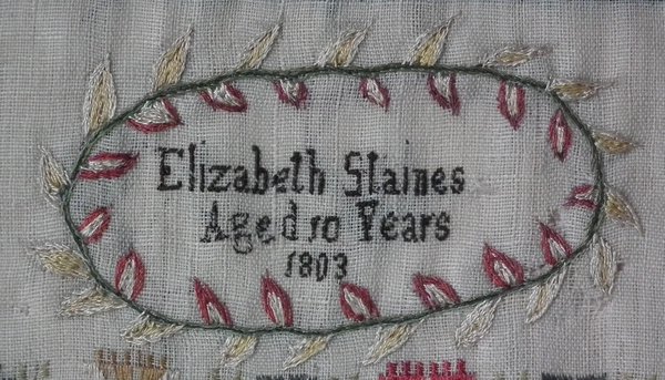 George III, dated 1803. 16ins high by 12.5ins wide. 1803 Sampler by Elizabeth Staines. Framed in an old wood frame with gilt slip and old glass.