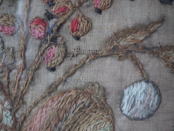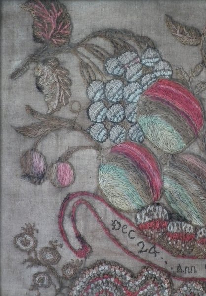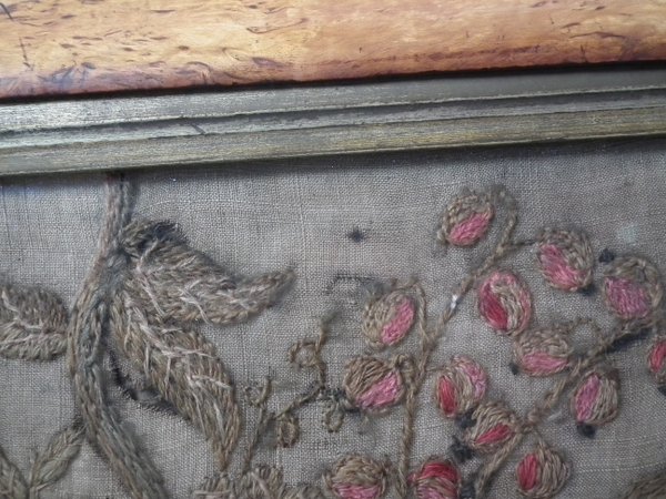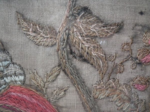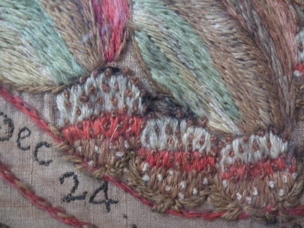 The sampler is worked in wool and silk on linen ground, in a variety of stitches.