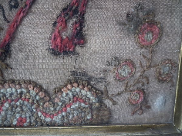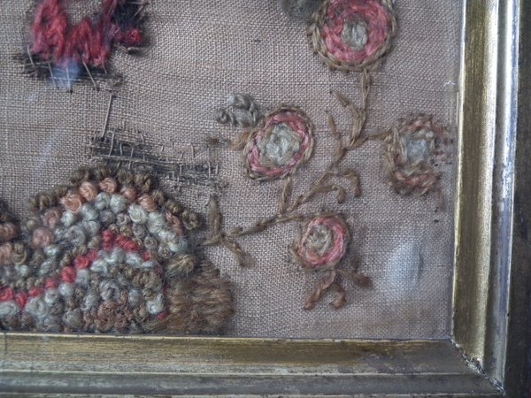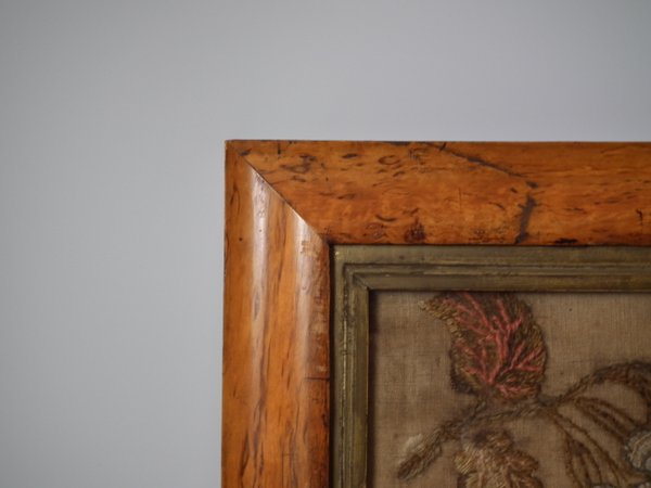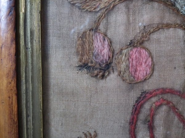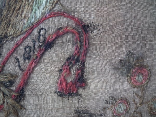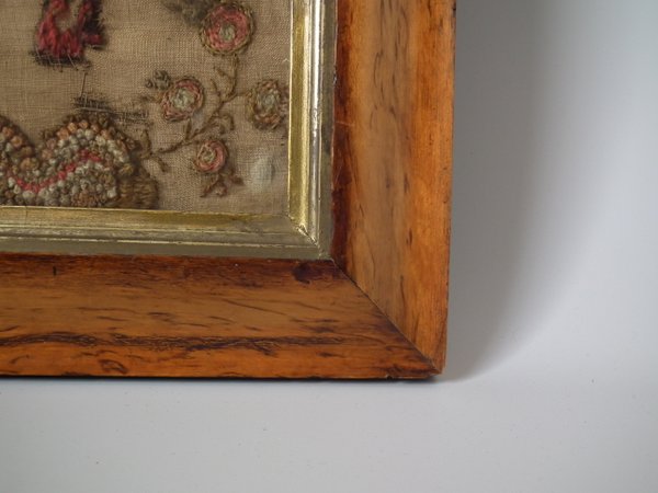 George III, dated 1818. 10.5ins high by 15ins wide. Antique Woolwork embroidery by Ann Griffiths 1818. Framed in an old, burr maple frame with rippled, old glass.