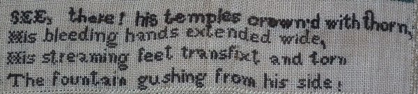 The sampler is worked in silk on linen ground, in a variety of stitches including Algerian eye.