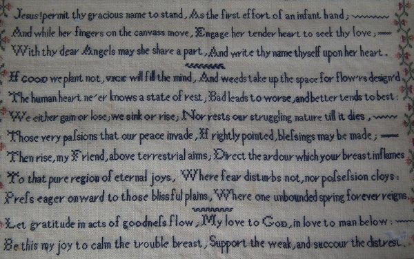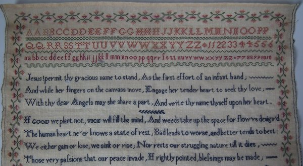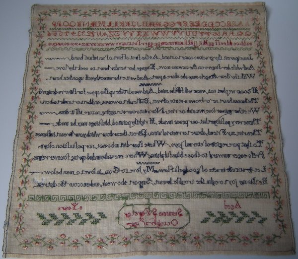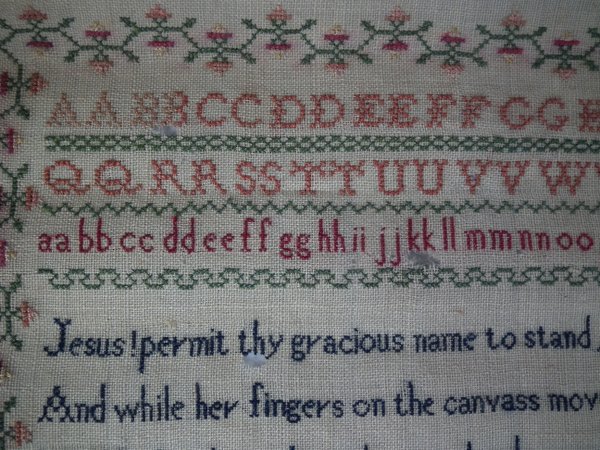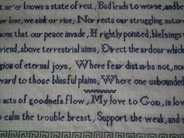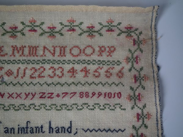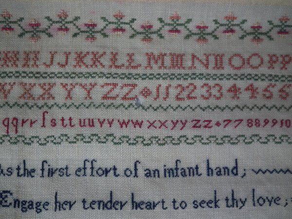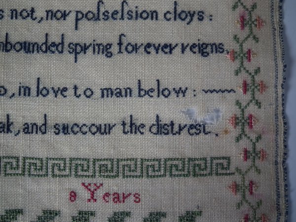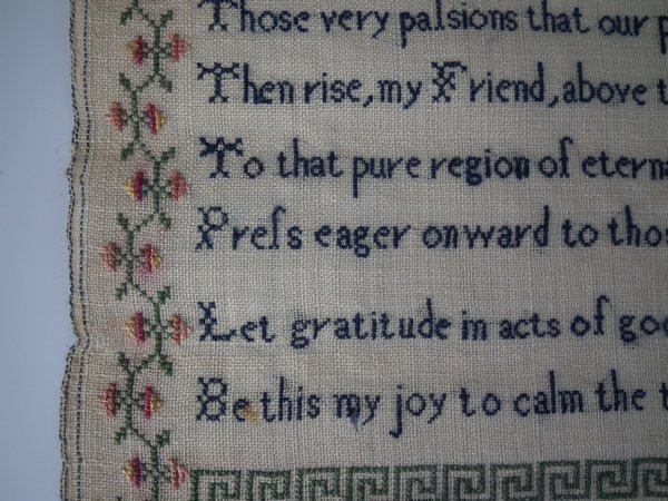 The sampler is worked in silk on linen ground, in cross stitch and Algerian eye.
