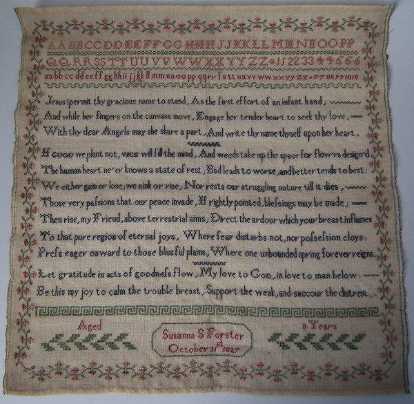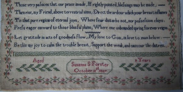 Unframed 1827 Sampler by Susanna Forster. Unframed.
