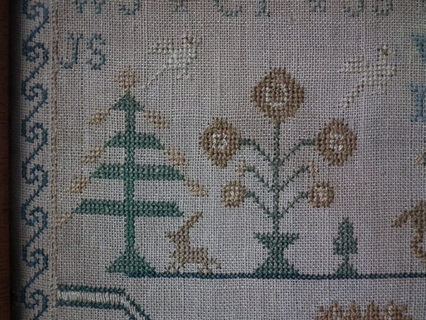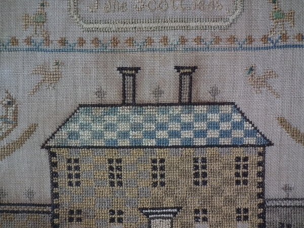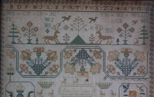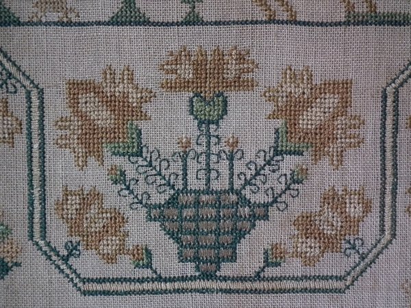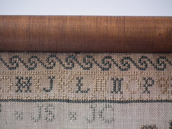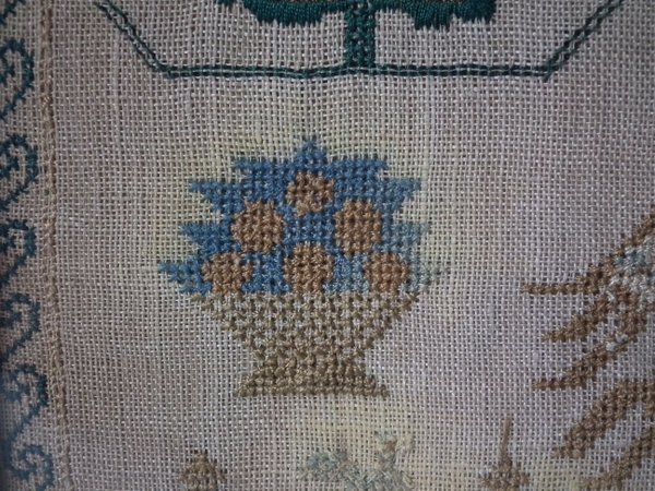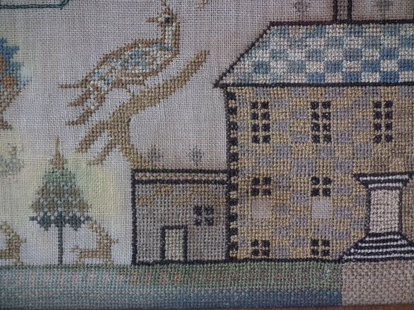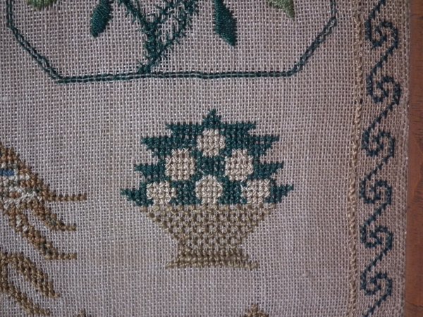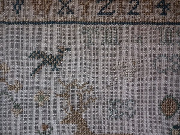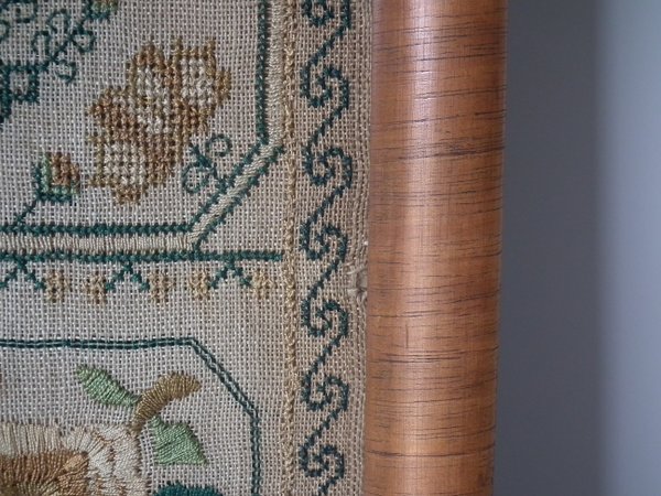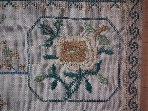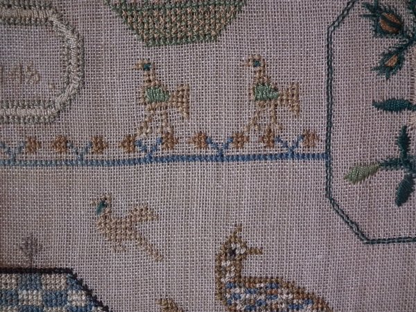 The sampler is worked in silk on canvas ground, in a variety of stitches.