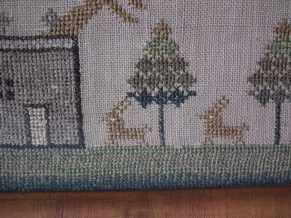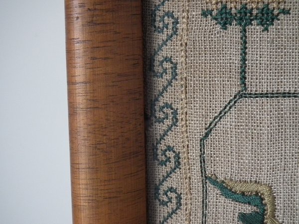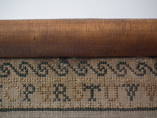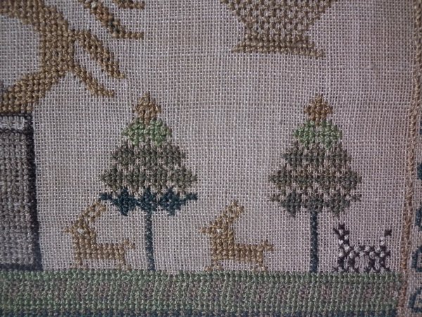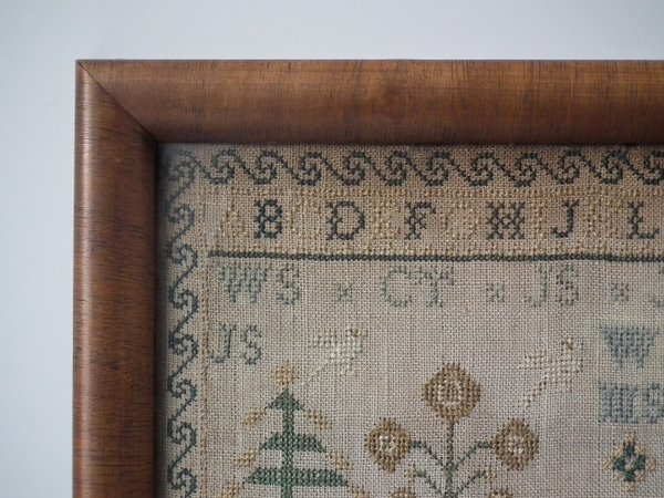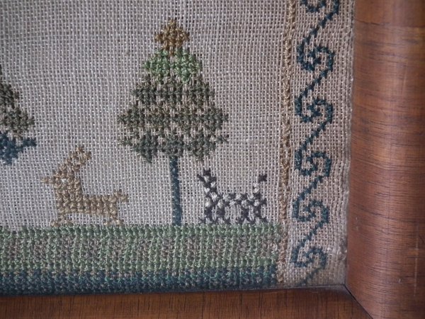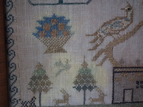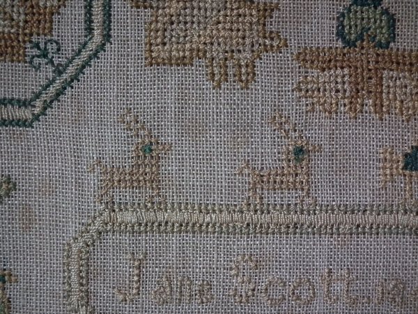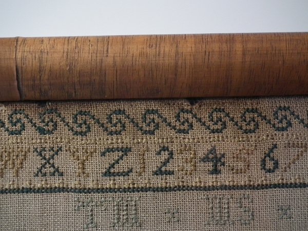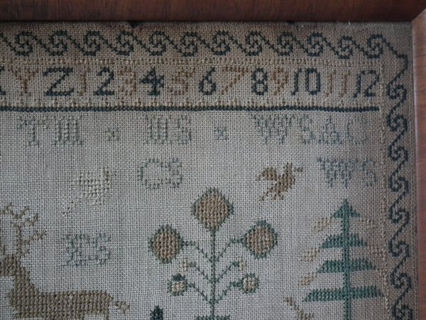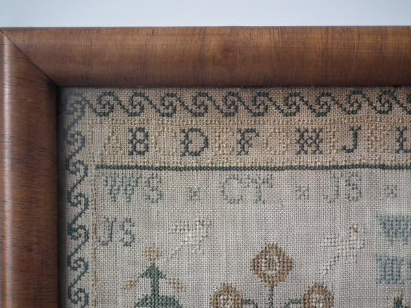The sampler is worked in silk on canvas ground, in a variety of stitches.
